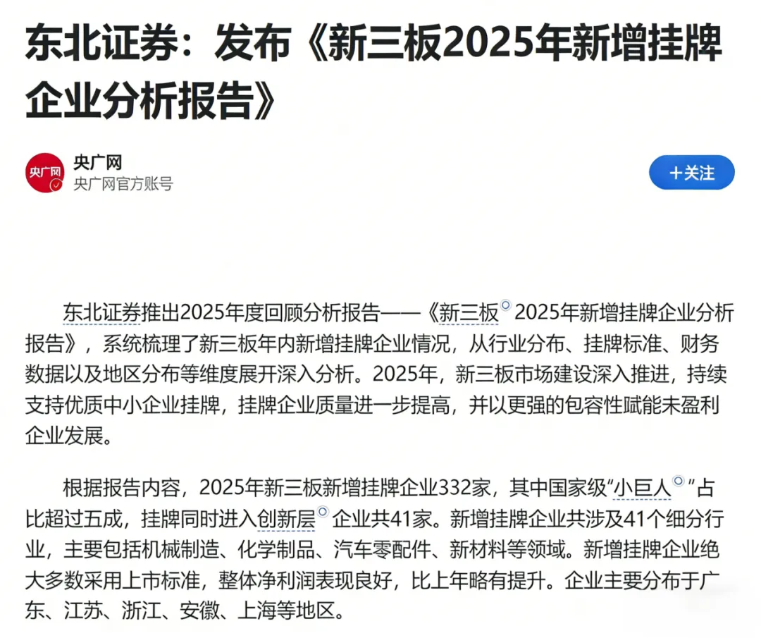 近日,本公众号经系统研究发布了《新三板2025年新增挂牌企业分析报告》,报告系统梳理了新三板年内新增挂牌企业情况,从行业分布、挂牌标准、财务数据以及地区分布等维度展开深入分析,引发了官方媒体、专业机构、知名高校及同业伙伴的广泛关注。知名官方媒体“央广网”对该报告进行了专题报道。
