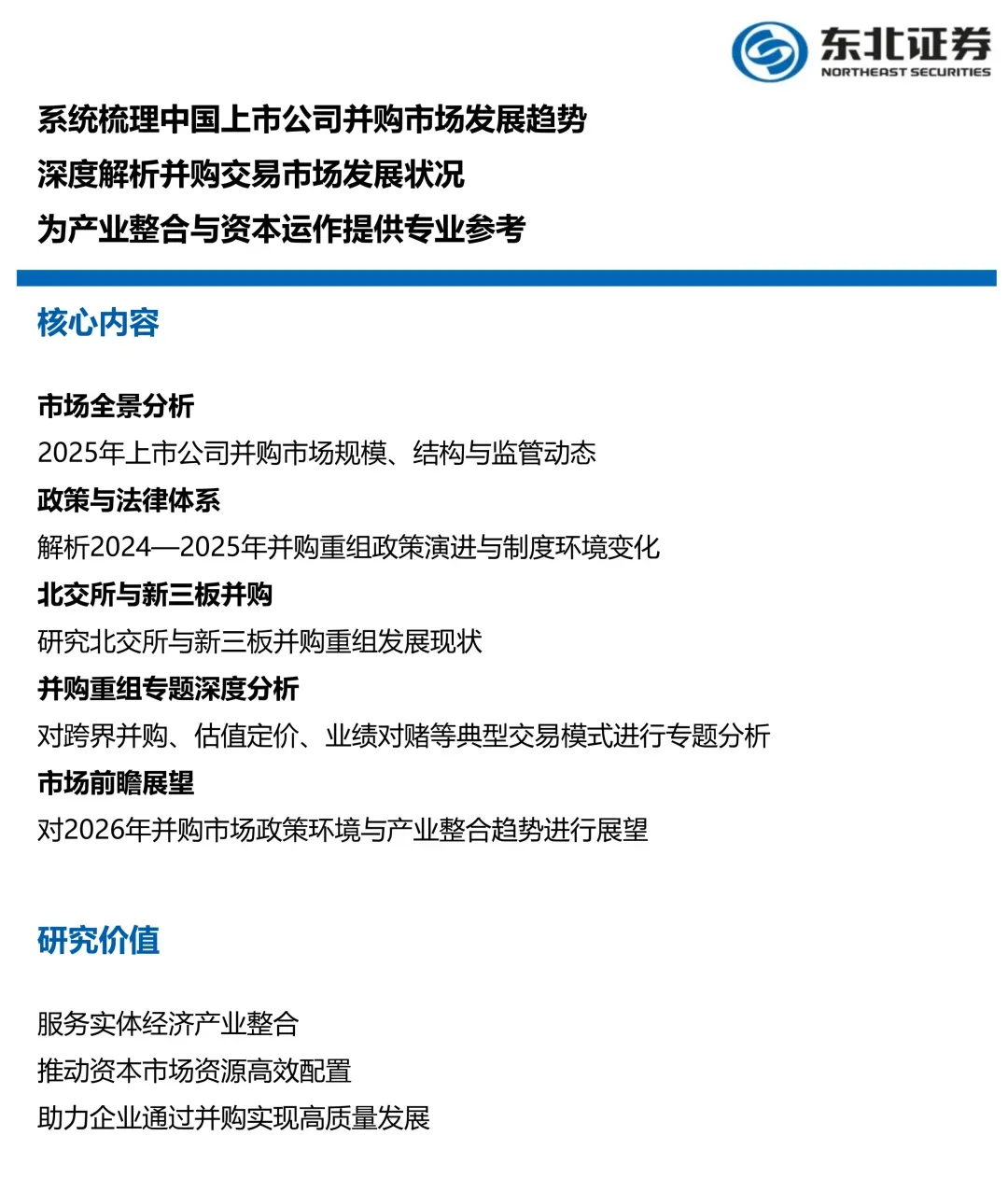 在推进资本市场服务的同时,东北证券强化资本市场研究与社会服务,拟于近期推出《上市公司并购白皮书(2025年)》,从多个维度系统分析全年并购市场的发展演进与重要事项,敬请关注!