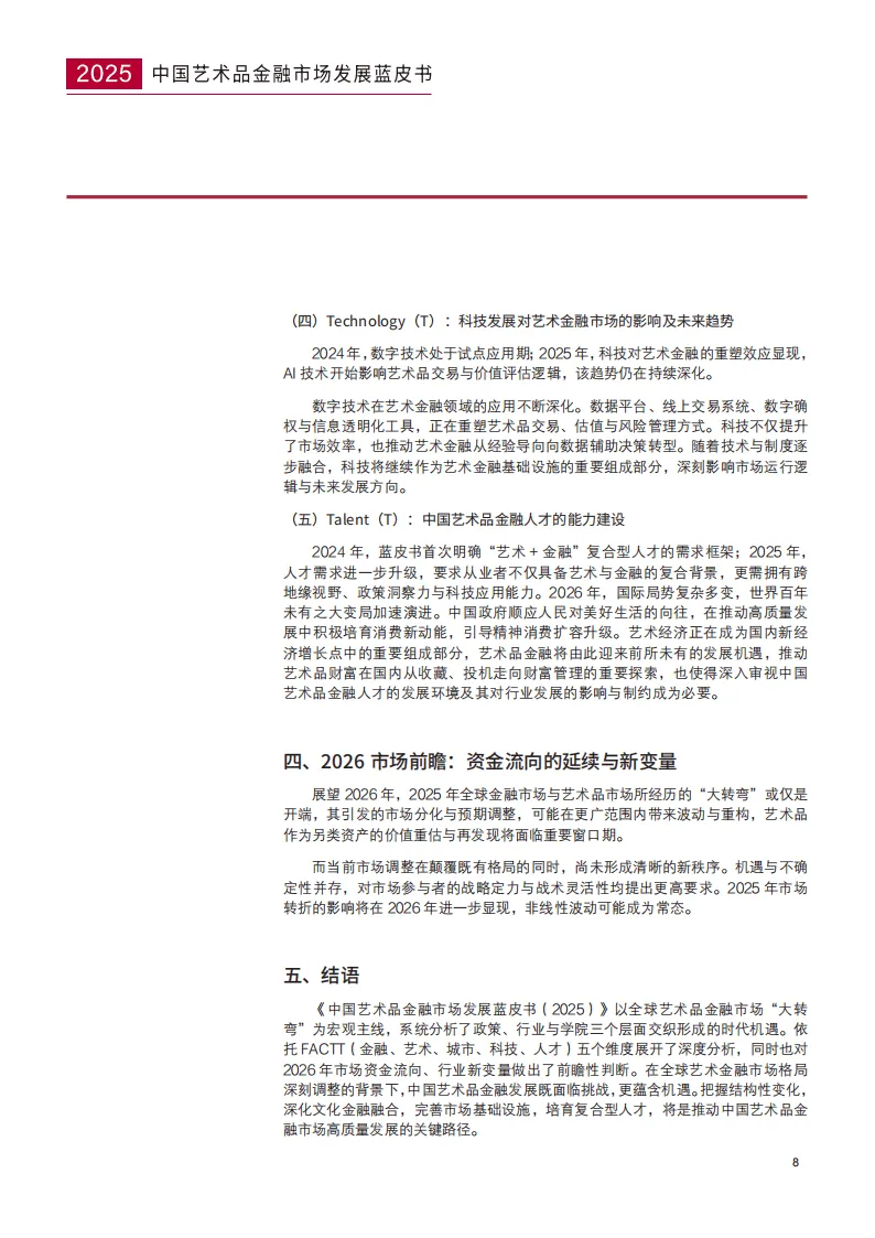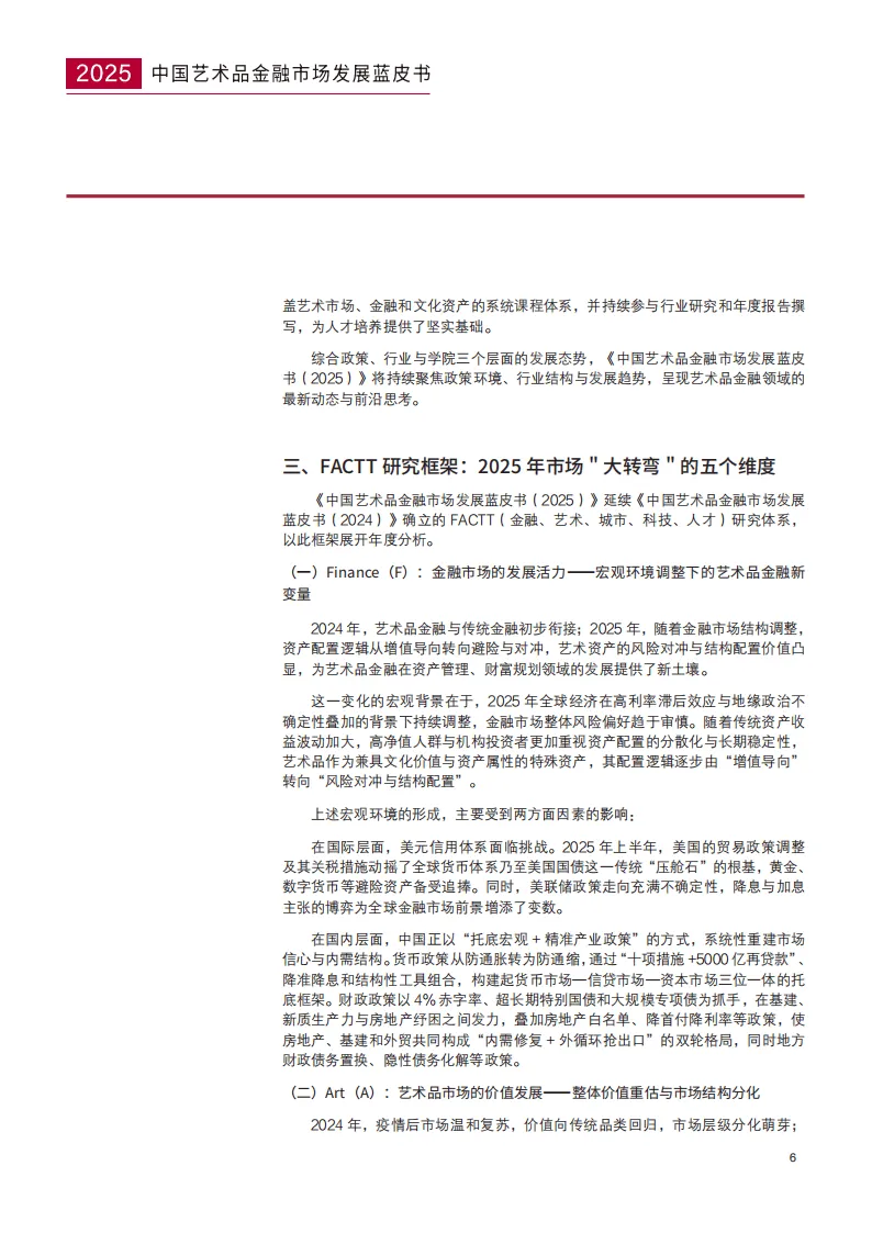 《中国艺术品金融市场发展蓝皮书(2025)》以全球艺术品金融市场“大转弯”为核心主线,依托FACTT(金融、艺术、城市、科技、人才)研究框架,系统分析了宏观环境变化对艺术品金融市场的深远影响,呈现了行业发展的新动态与新趋势。