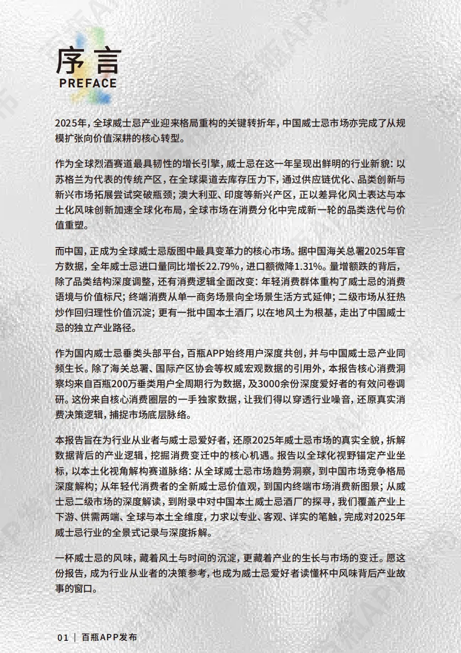 2025年是全球威士忌产业格局重构的关键年,中国市场则完成从规模扩张到价值深耕的转型,成为全球版图中极具变革力的核心市场。这份基于百瓶APP用户数据与权威机构信息的行业报告,展现了威士忌行业全球与本土的多维发展特征。