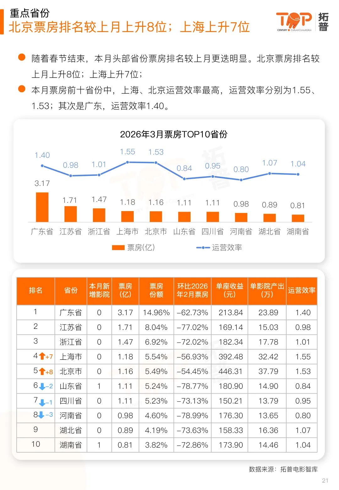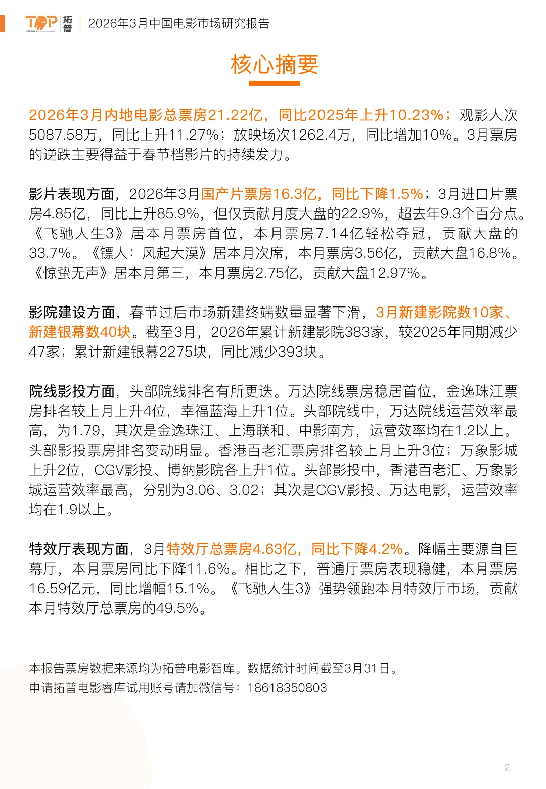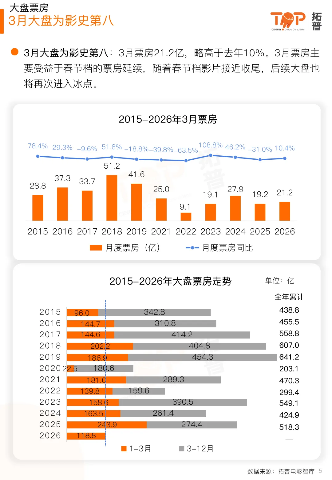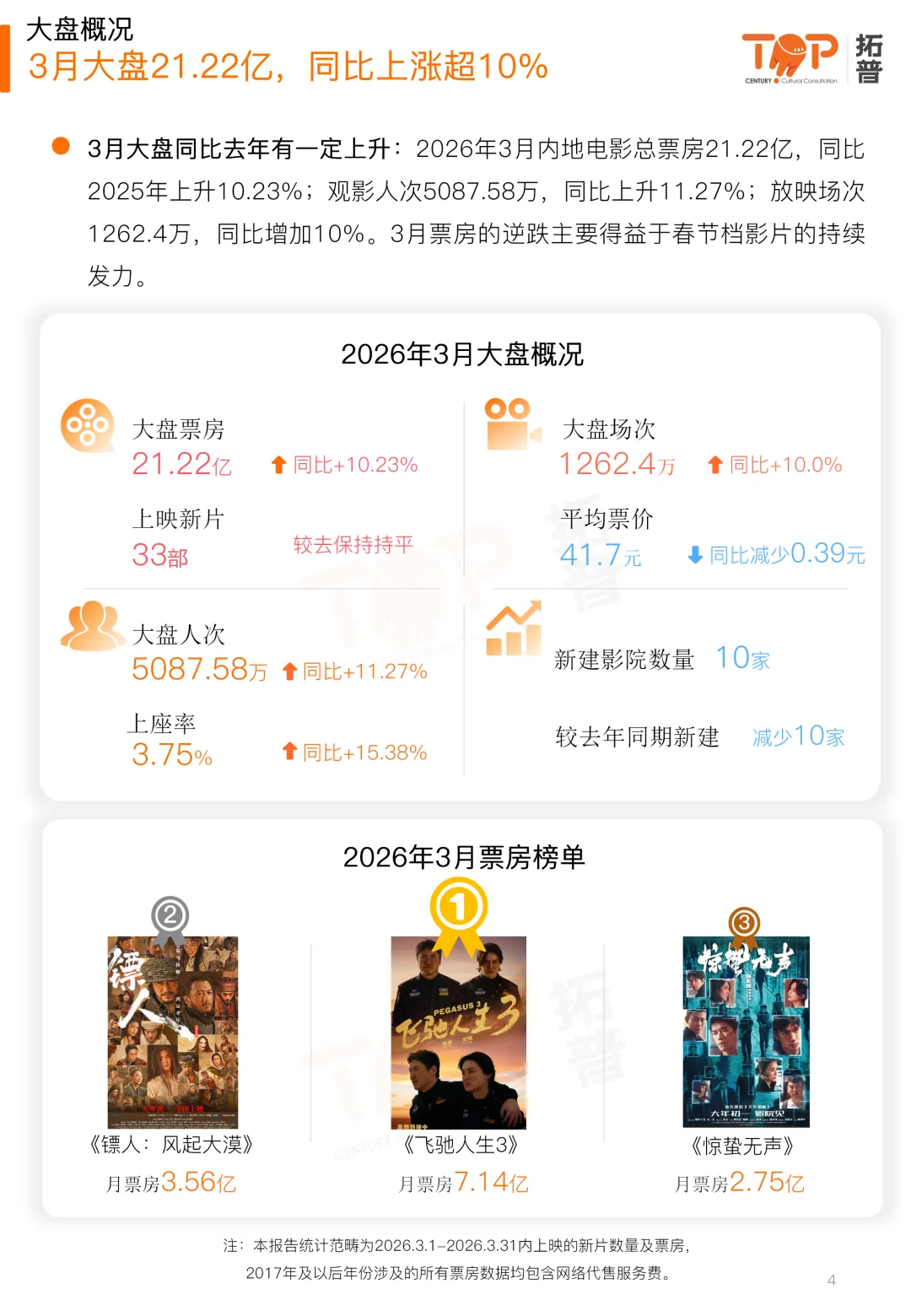 2026年3月内地电影总票房21.22亿,同比2025年上升10.23%;观影人次5087.58万,同比上升11.27%;放映场次1262.4万,同比增加10%。3月票房的逆跌主要得益于春节档影片的持续发力。