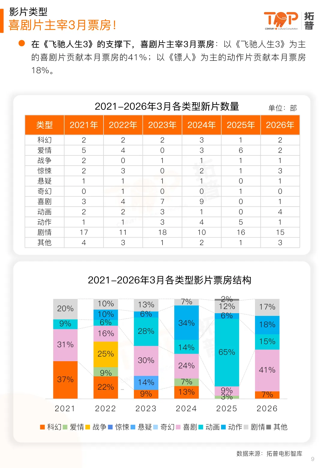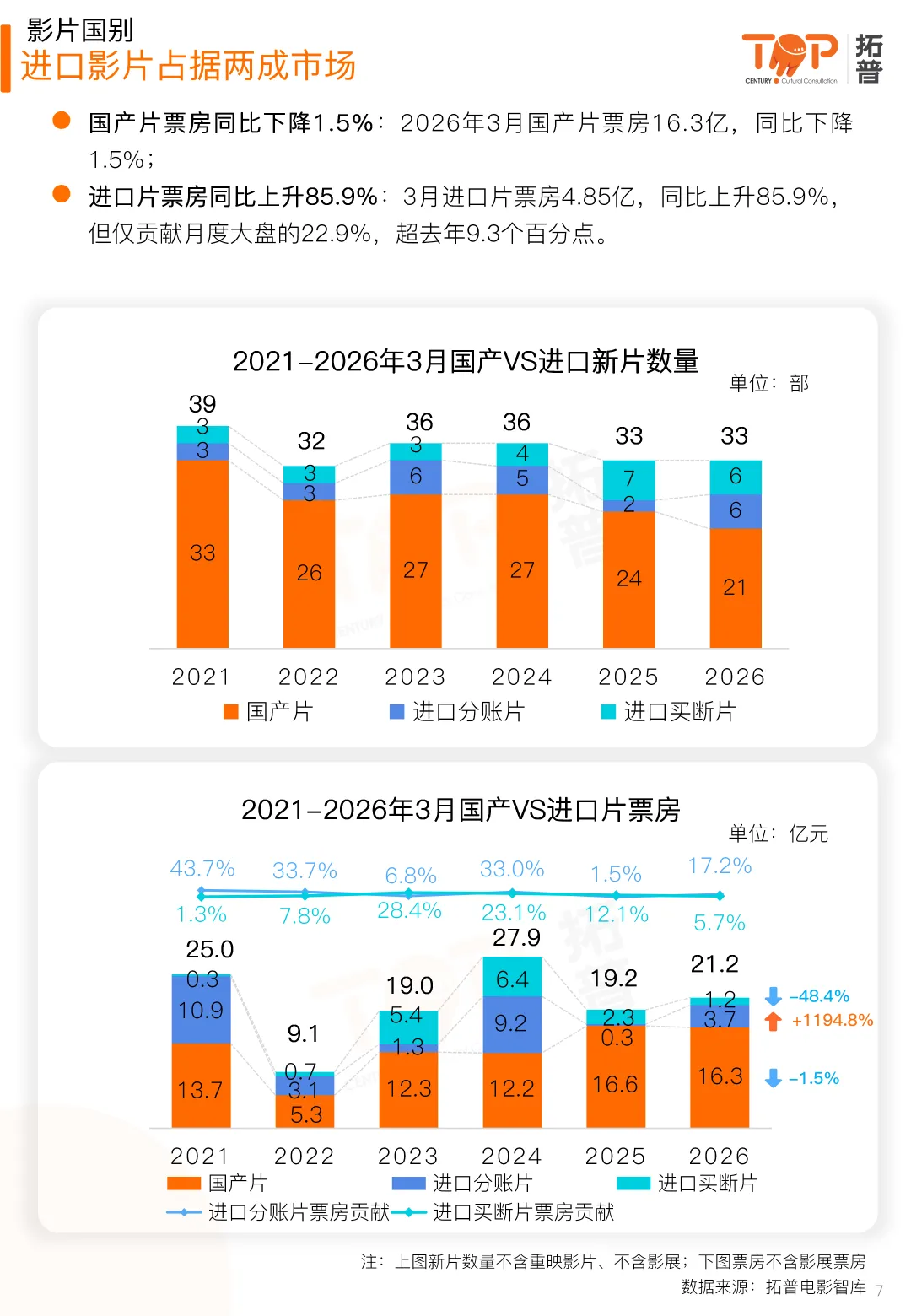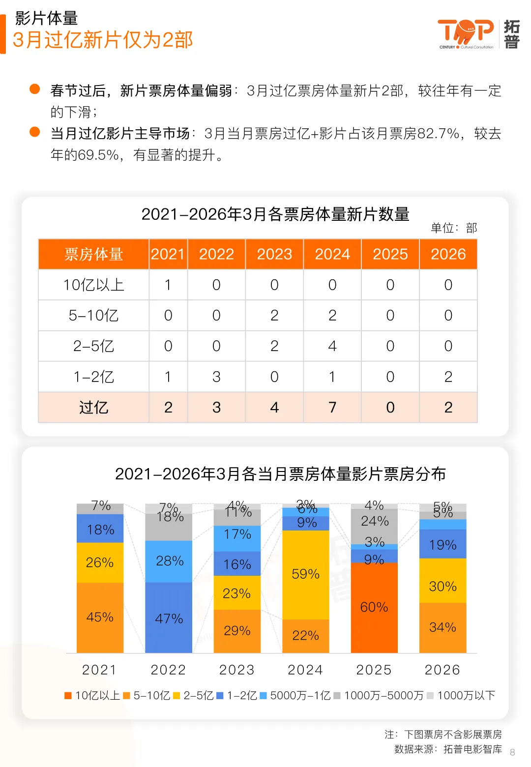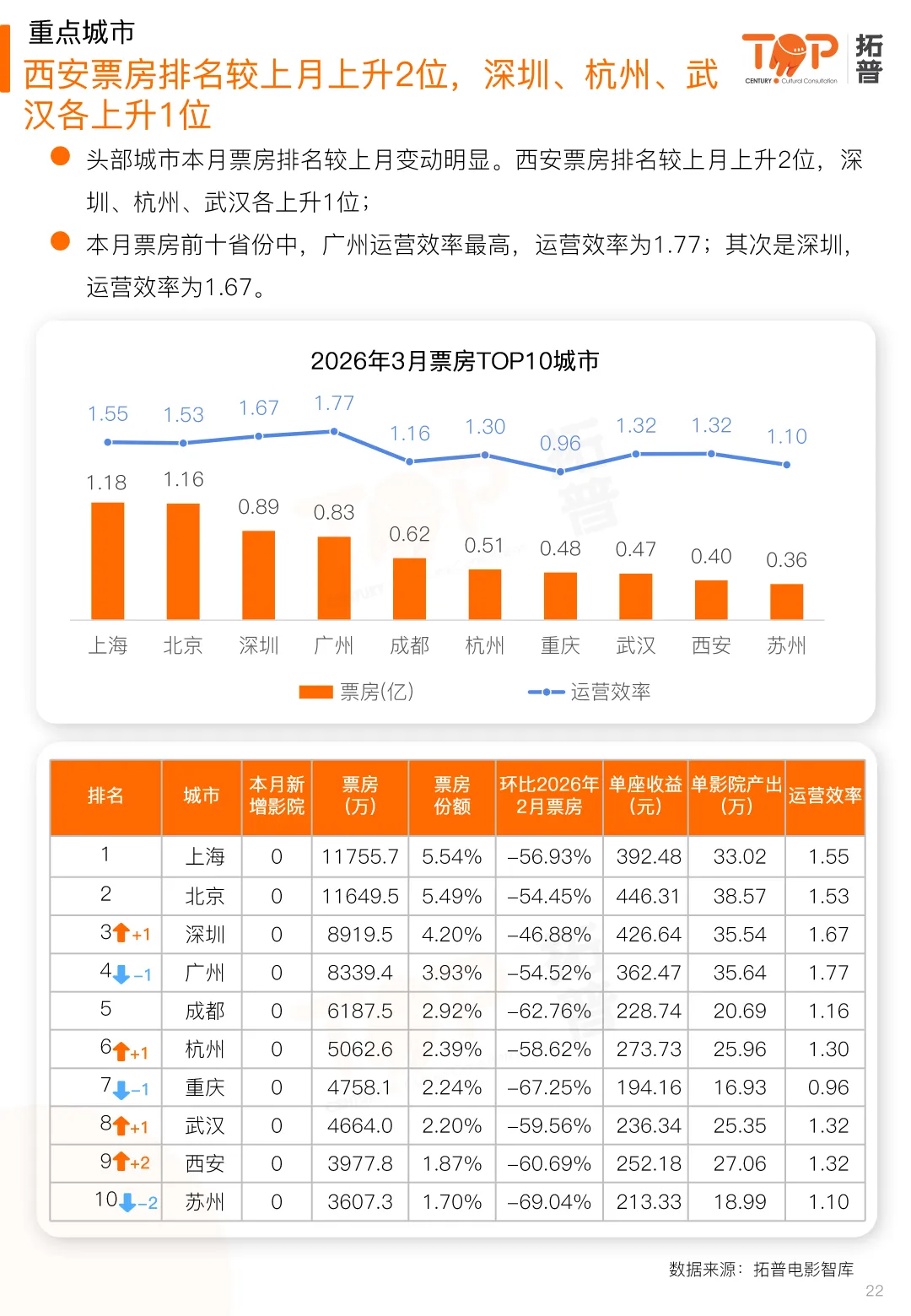 2026年3月内地电影总票房21.22亿,同比2025年上升10.23%;观影人次5087.58万,同比上升11.27%;放映场次1262.4万,同比增加10%。3月票房的逆跌主要得益于春节档影片的持续发力。