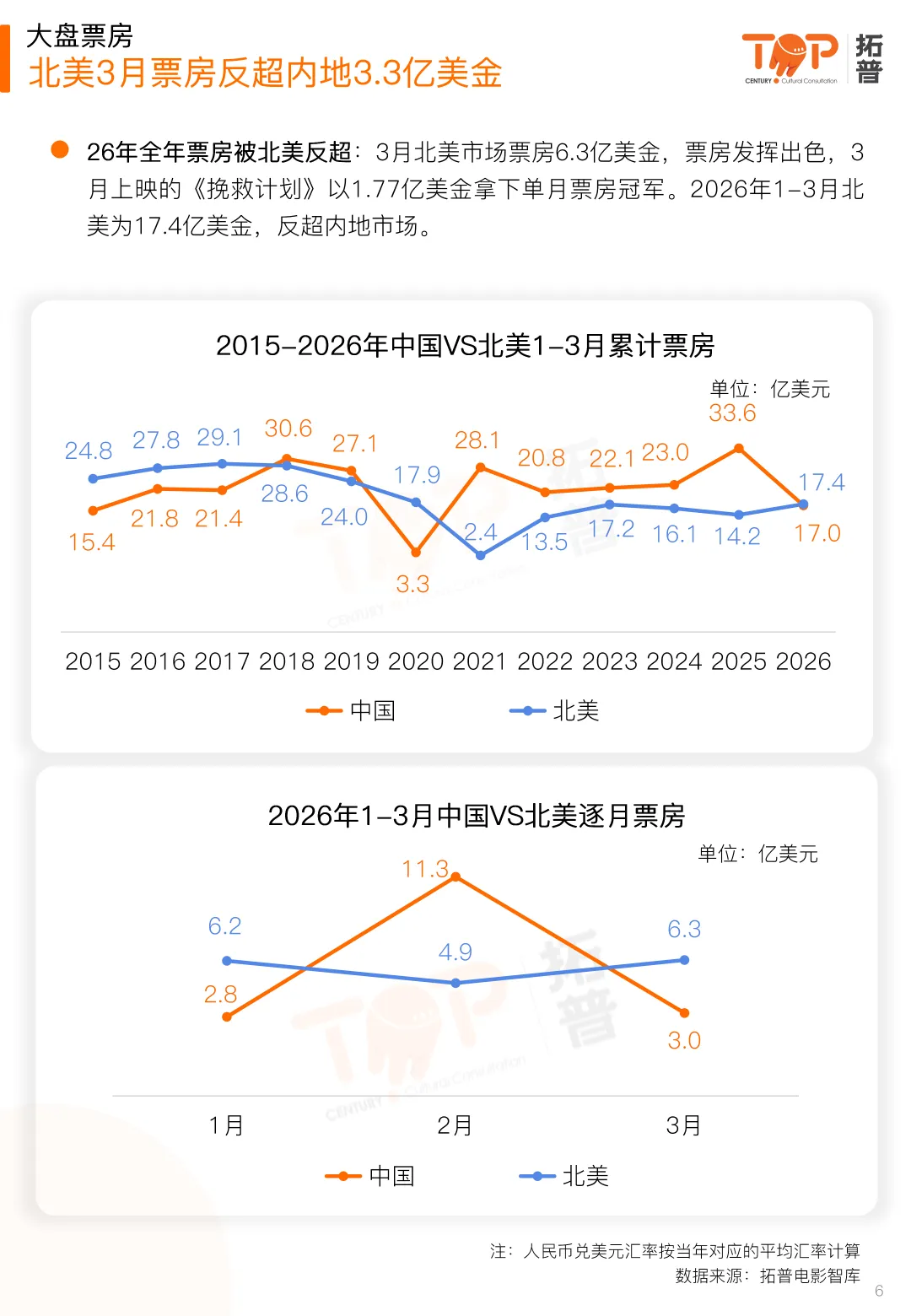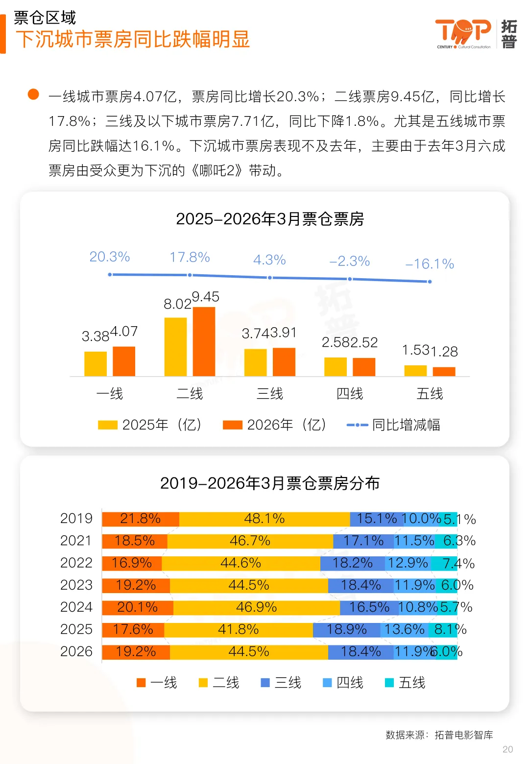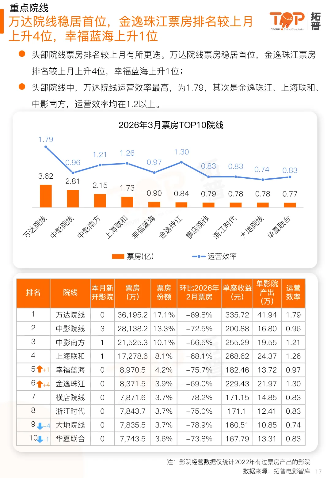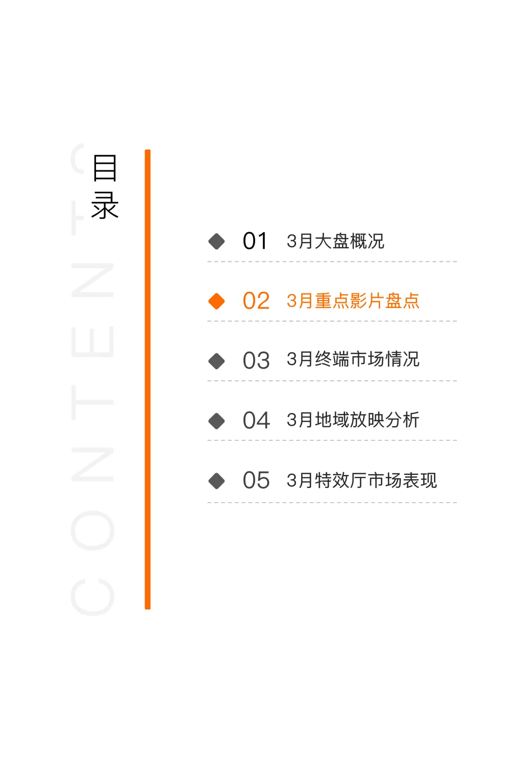 2026年3月内地电影总票房21.22亿,同比2025年上升10.23%;观影人次5087.58万,同比上升11.27%;放映场次1262.4万,同比增加10%。3月票房的逆跌主要得益于春节档影片的持续发力。