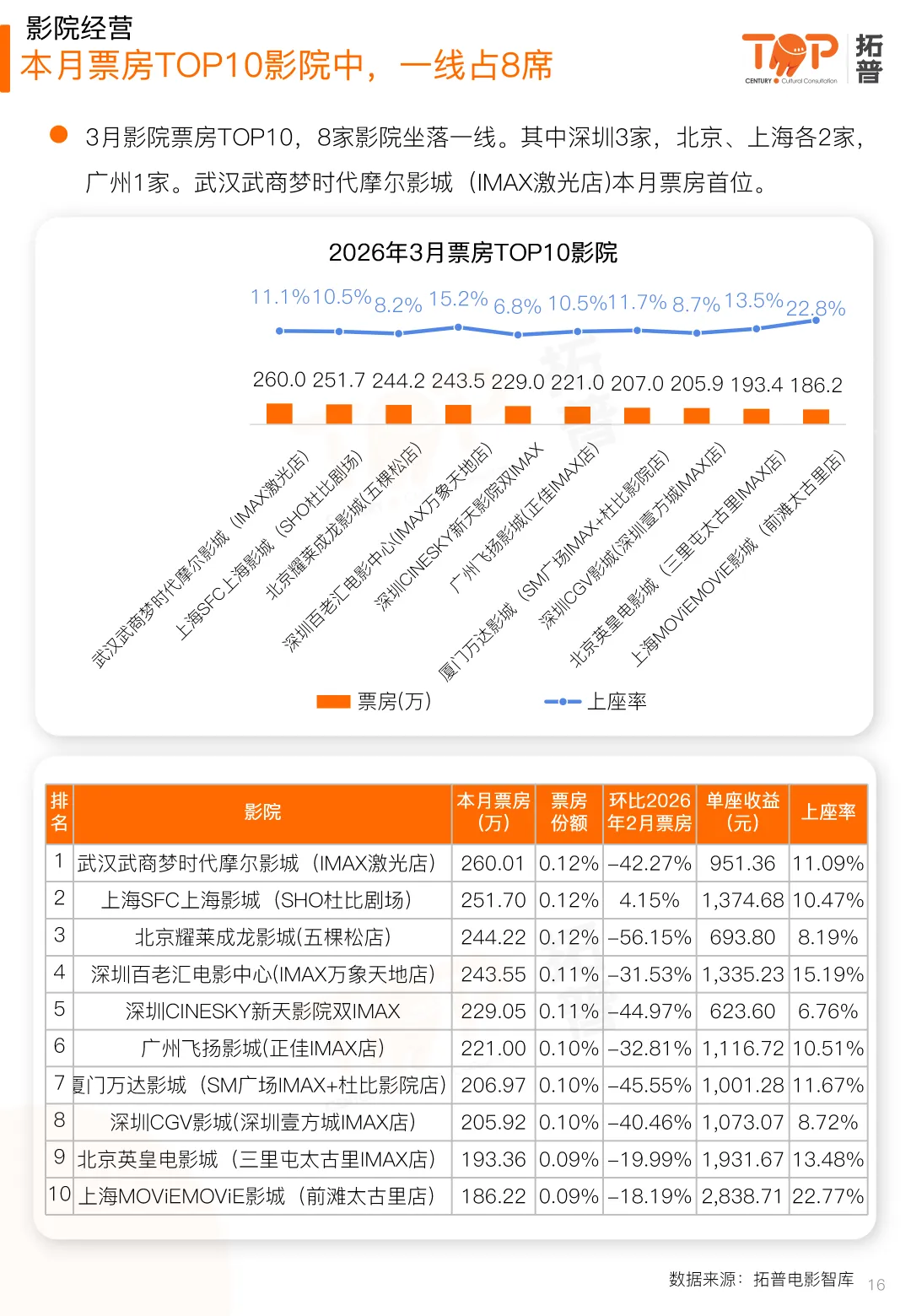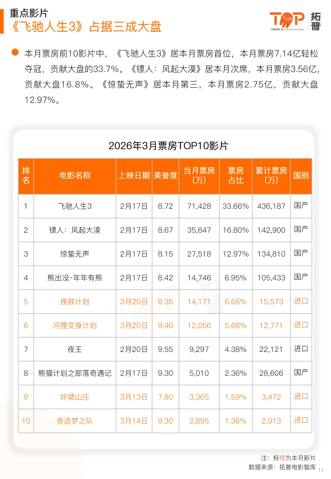 影片表现方面,2026年3月国产片票房16.3亿,同比下降1.5%;3月进口片票房4.85亿,同比上升85.9%,但仅贡献月度大盘的22.9%,超去年9.3个百分点。《飞驰人生3》居本月票房首位,本月票房7.14亿轻松夺冠,贡献大盘的33.7%。《镖人:风起大漠》居本月次席,本月票房3.56亿,贡献大盘16.8%。《惊蛰无声》居本月第三,本月票房2.75亿,贡献大盘12.97%。
