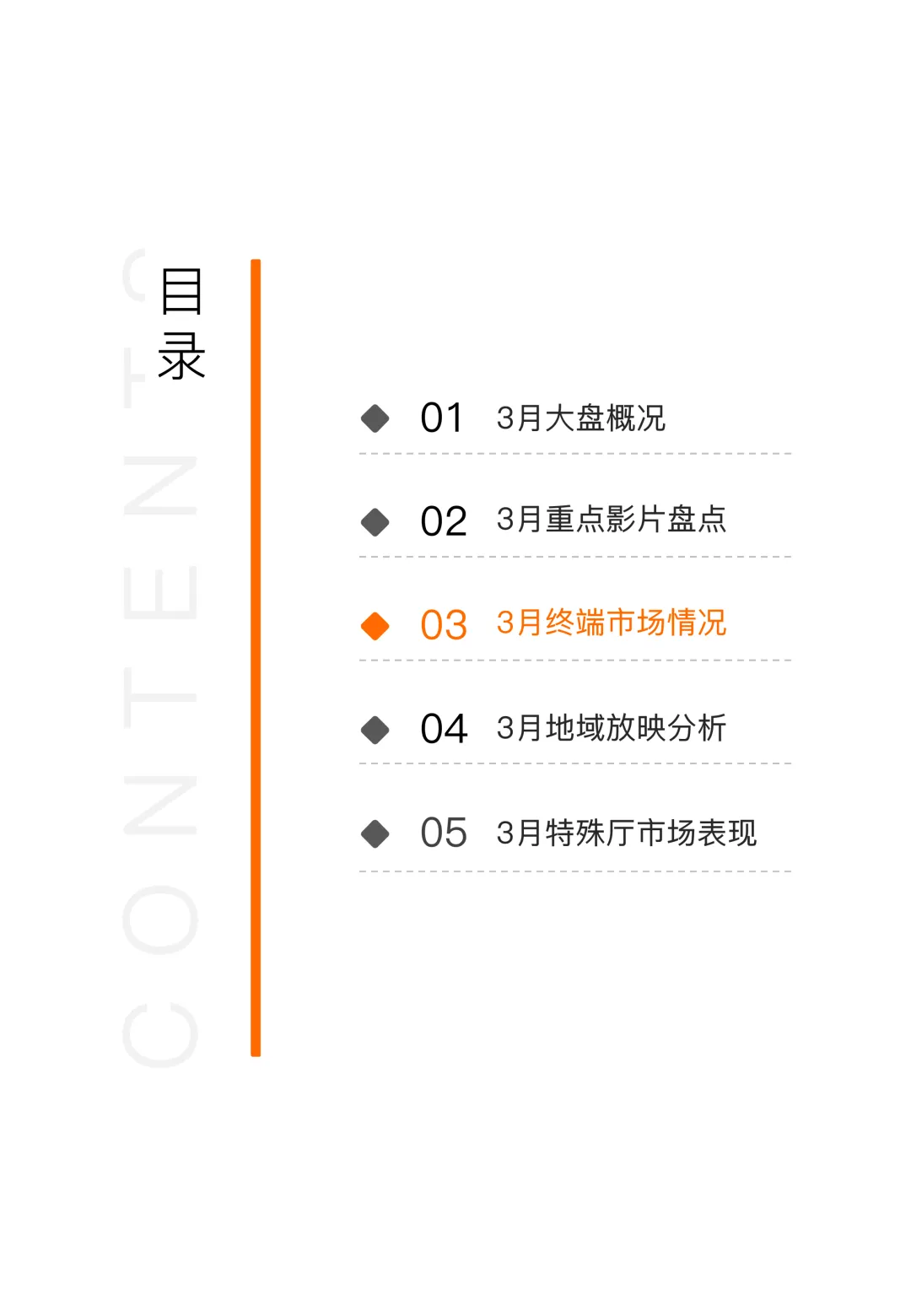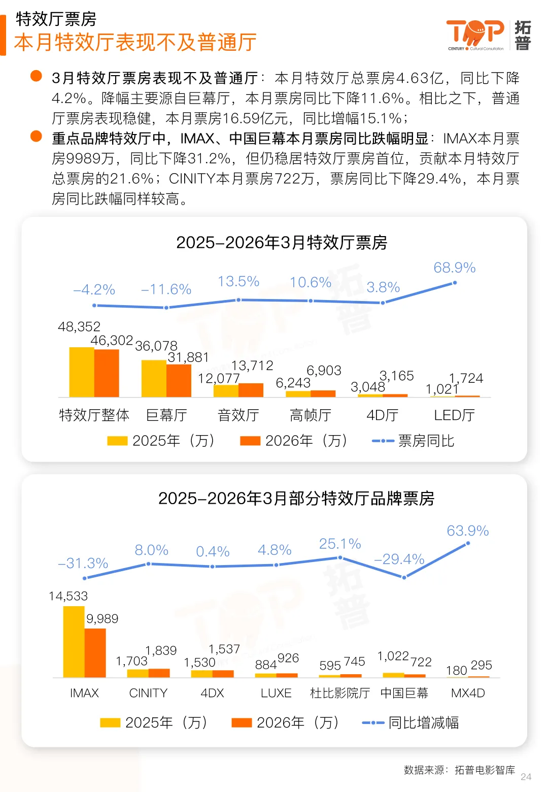 特效厅表现方面,3月特效厅总票房4.63亿,同比下降4.2%。降幅主要源自巨幕厅,本月票房同比下降11.6%。相比之下,普通厅票房表现稳健,本月票房16.59亿元,同比增幅15.1%。《飞驰人生3》强势领跑本月特效厅市场,贡献本月特效厅总票房的49.5%。