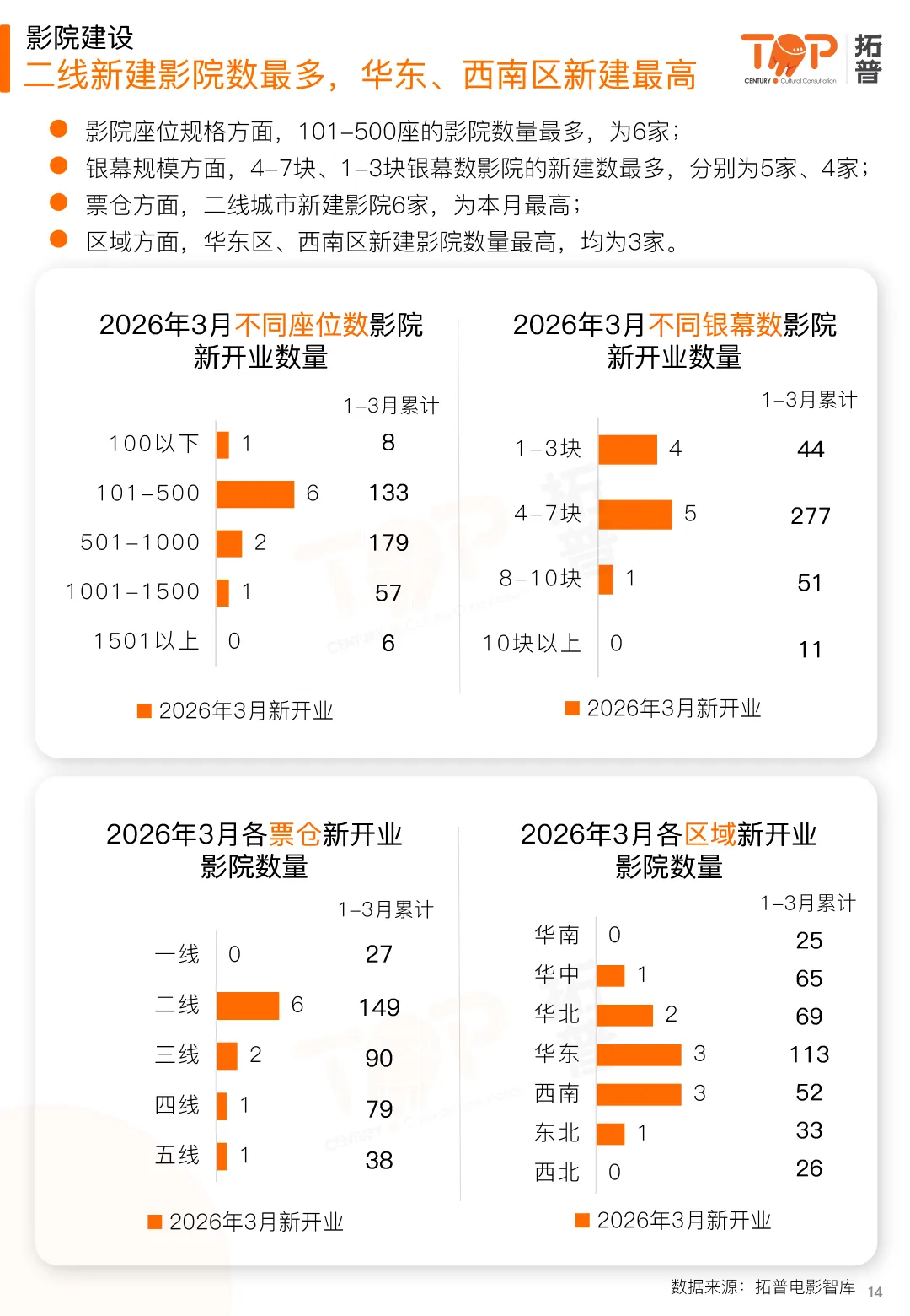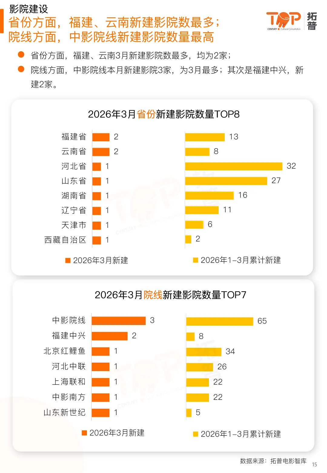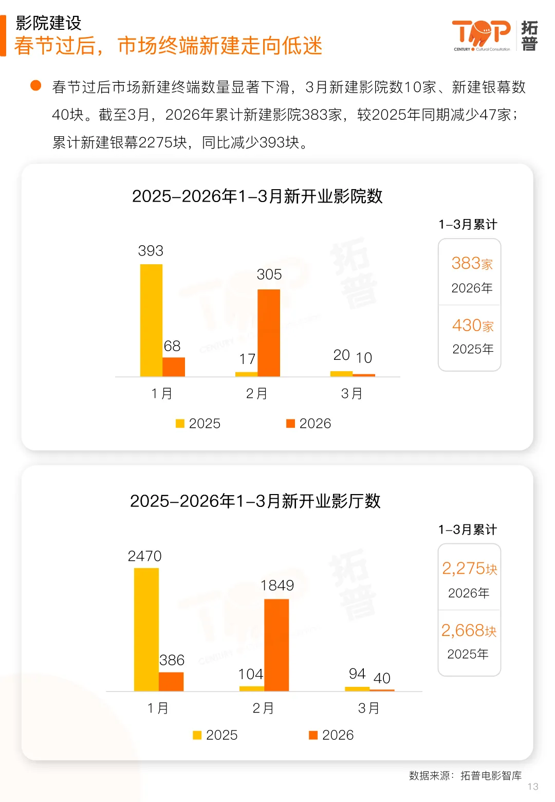 影院建设方面,春节过后市场新建终端数量显著下滑,3月新建影院数10家、新建银幕数40块。截至3月,2026年累计新建影院383家,较2025年同期减少47家;累计新建银幕2275块,同比减少393块。