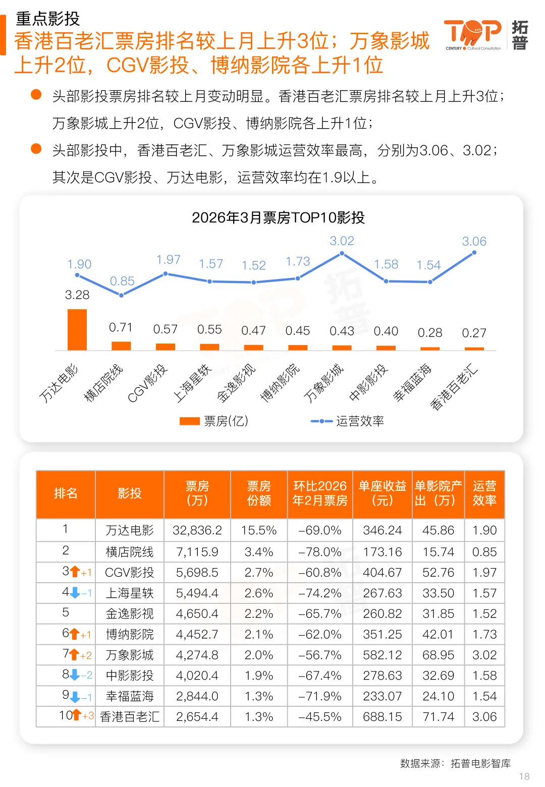 院线影投方面,头部院线排名有所更迭。万达院线票房稳居首位,金逸珠江票房排名较上月上升4位,幸福蓝海上升1位。头部院线中,万达院线运营效率最高,为1.79,其次是金逸珠江、上海联和、中影南方,运营效率均在1.2以上。头部影投票房排名变动明显。香港百老汇票房排名较上月上升3位;万象影城上升2位,CGV影投、博纳影院各上升1位。头部影投中,香港百老汇、万象影城运营效率最高,分别为3.06、3.02;其次是CGV影投、万达电影,运营效率均在1.9以上。