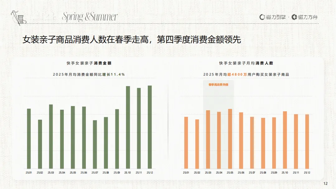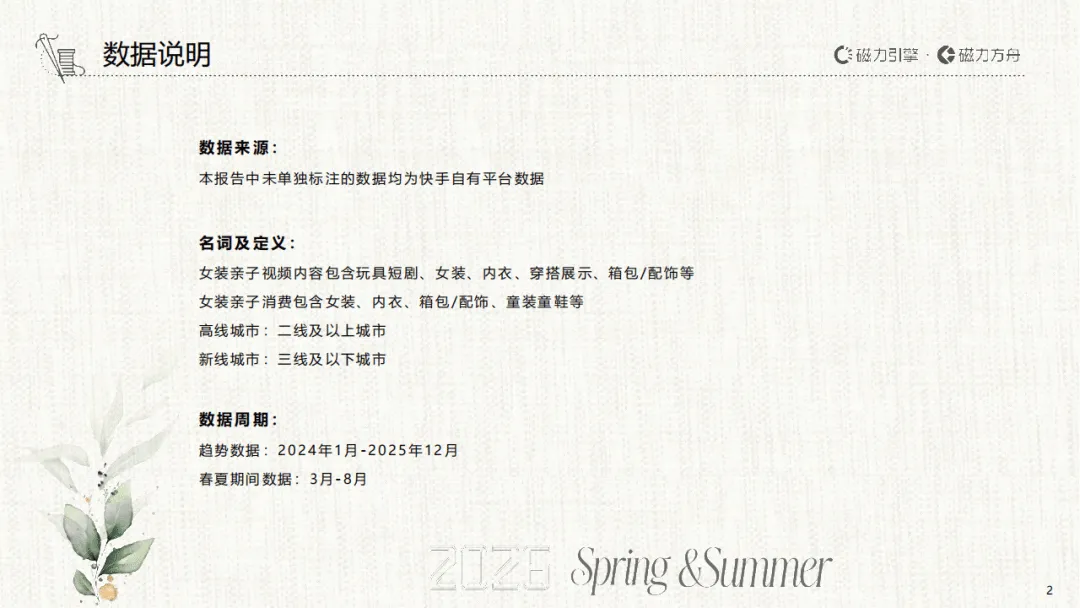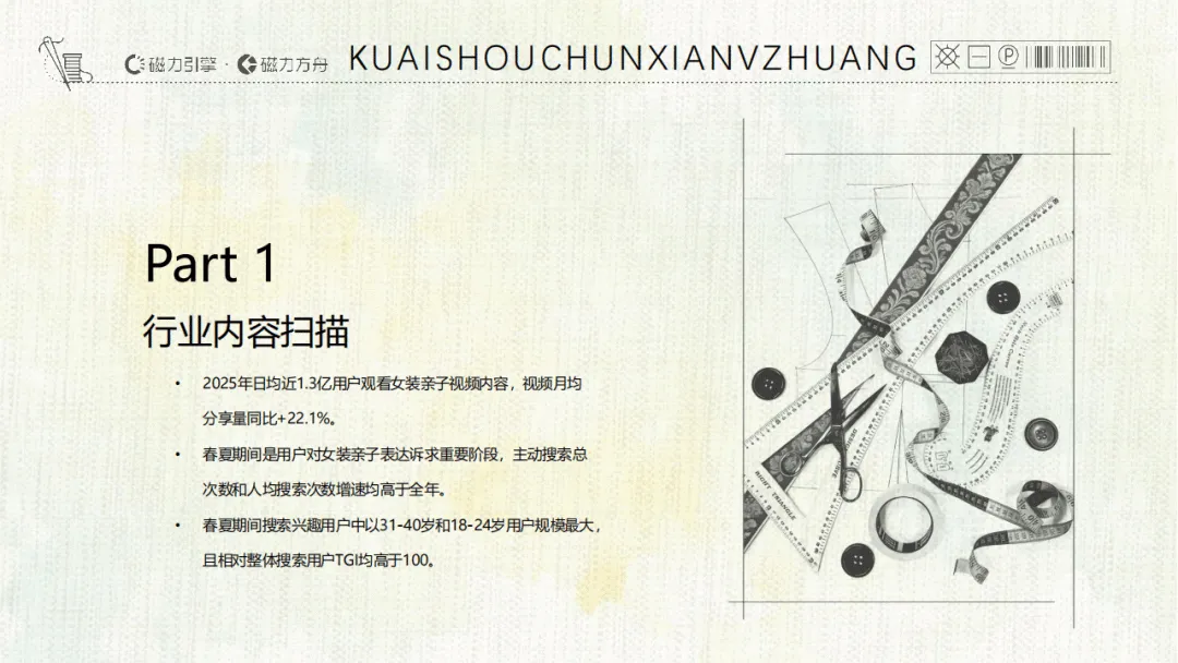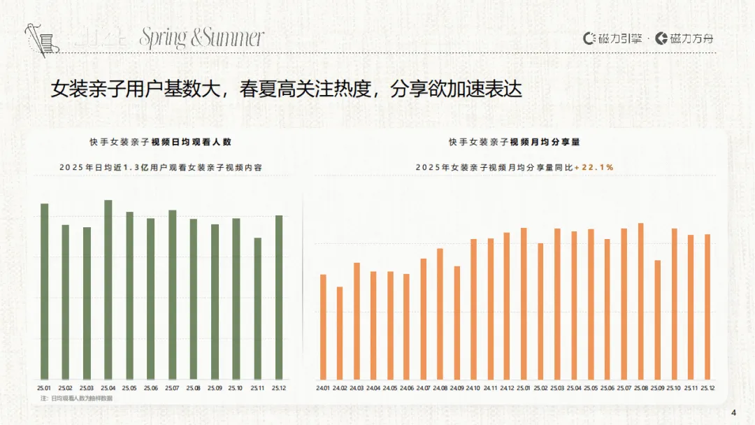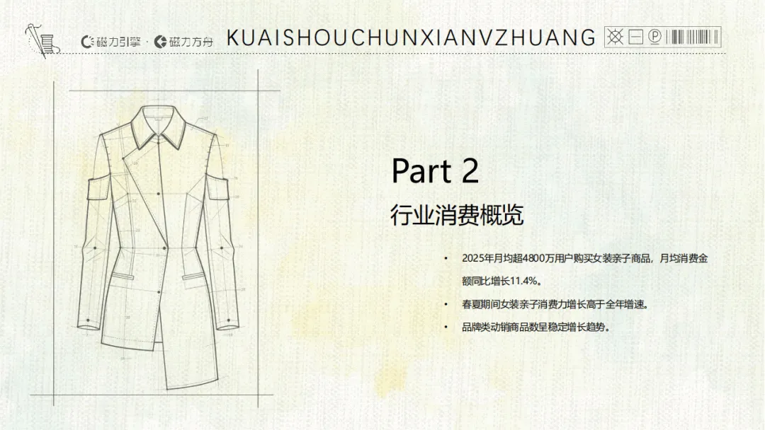 这份快手2026春夏女装亲子数据报告,依托2024-2025年平台数据,从内容生态、整体消费、细分品类三大维度,展现了快手女装亲子领域的发展特征与消费趋势。2025年该领域用户基础深厚,日均近1.3亿用户观看相关视频,月均分享量同比增长22.1%,春夏成为内容传播与用户互动的核心阶段,细分视频播放量占全年过半,穿搭展示、内衣类视频互动效率提升尤为显著,高级感、高品质、柔软舒适类内容更受用户关注。