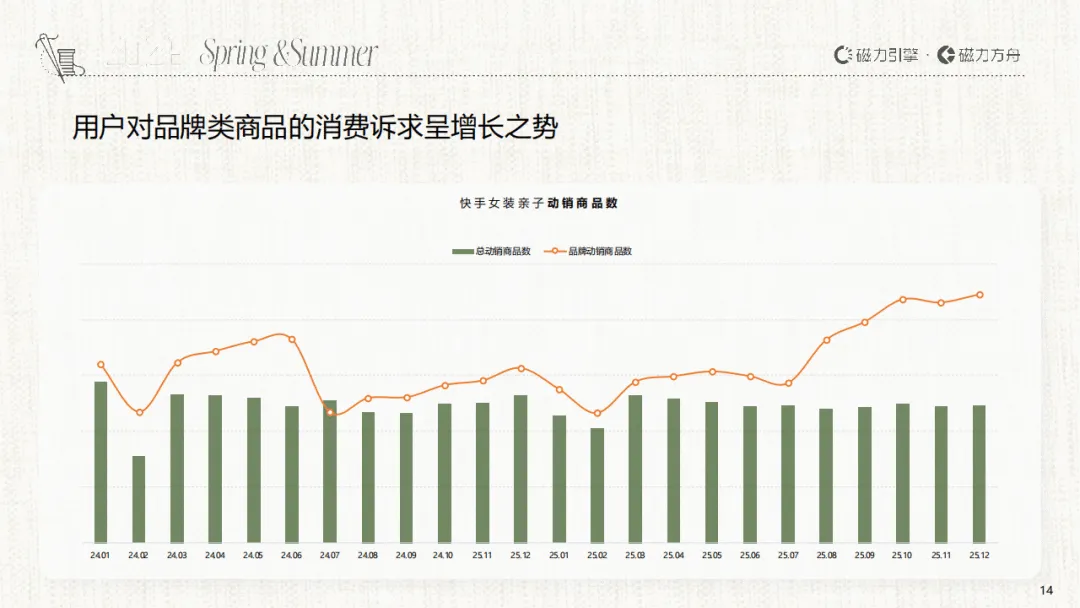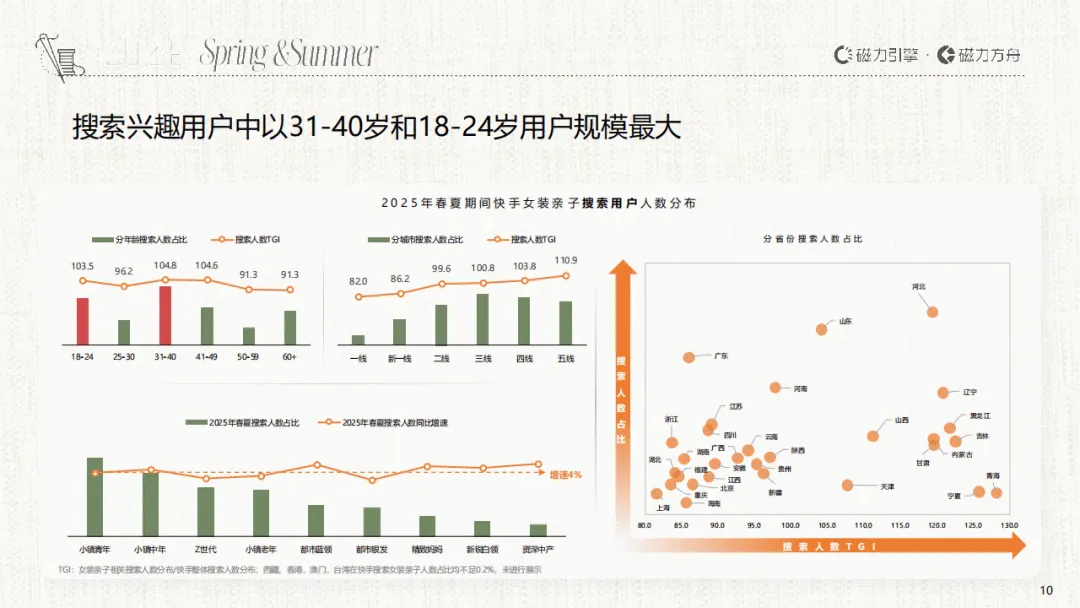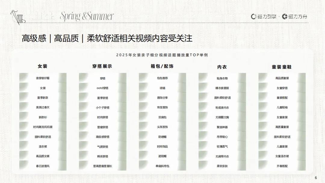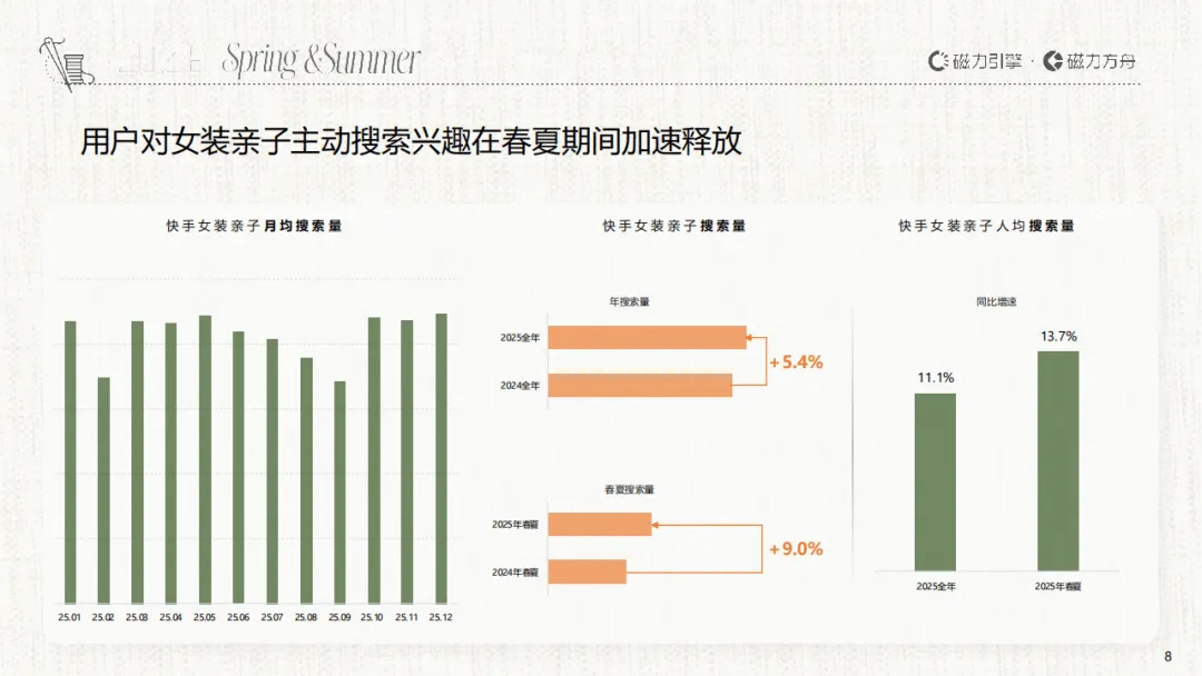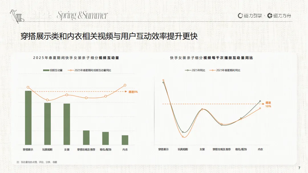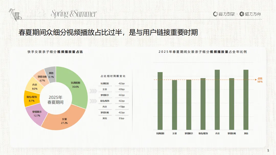 这份快手2026春夏女装亲子数据报告,依托2024-2025年平台数据,从内容生态、整体消费、细分品类三大维度,展现了快手女装亲子领域的发展特征与消费趋势。2025年该领域用户基础深厚,日均近1.3亿用户观看相关视频,月均分享量同比增长22.1%,春夏成为内容传播与用户互动的核心阶段,细分视频播放量占全年过半,穿搭展示、内衣类视频互动效率提升尤为显著,高级感、高品质、柔软舒适类内容更受用户关注。