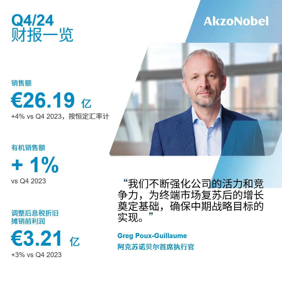 阿克苏诺贝尔首席执行官Greg Poux-Guillaume表示:“2024年,我们在复杂市场环境下仍实现有机增长,提升了调整后EBITDA,彰显了业务的韧性。第四季度调整后EBITDA同比增长3%,按恒定汇率计算,成本已与上年同期持平。我们持续推进优化措施,并取得了积极进展。