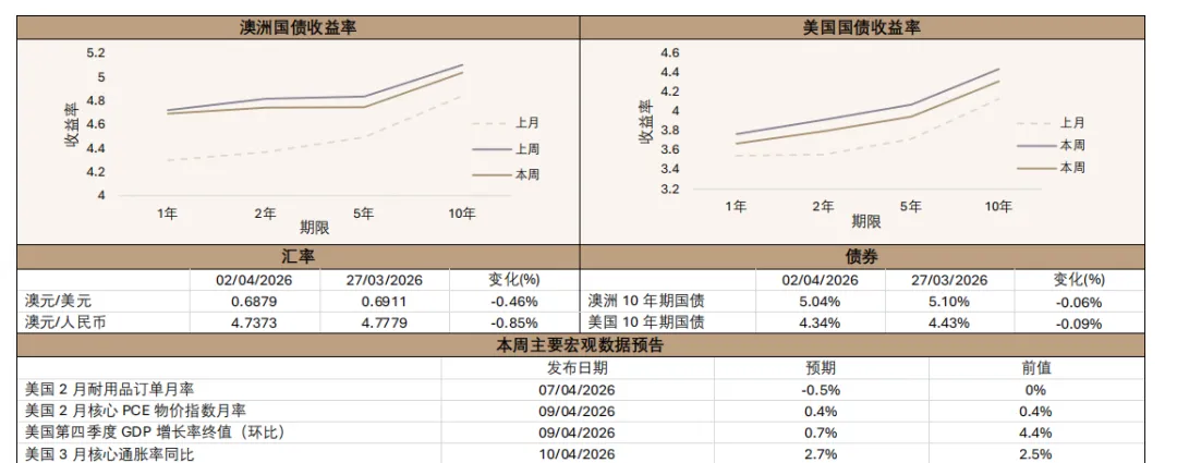 上周数据显示,欧洲消费者信心开始走弱,而美国方面,谘商会消费者信心指数改善并好于预期。同时,强劲的非农就业数据以及失业率降至4.3% (优于预期的 4.4%)进一步验证了美国经济的韧性。不过,上周多数数据仍属于滞后性的硬数据,尚未反映当前油价上升带来的影响。例如,美国、澳洲及韩国的贸易数据均好于预期;PMI整体表现稳健(澳洲终值除外),但部分略低于预期;就业数据整体符合预期,但 JOLTS 数据显示离职率及职位空缺均有所下降。我们将继续密切关注情绪指标,以获取对未来宏观数据的前瞻指引。