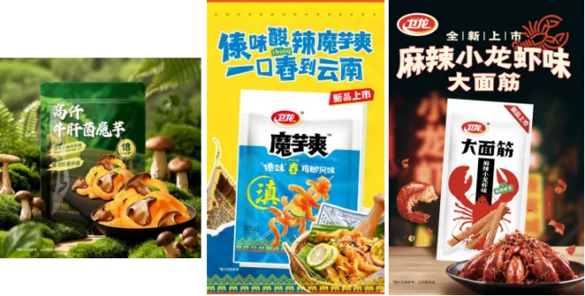 抓住Z世代“味蕾刺激与健康追求并存”的零食消费痛点,卫龙在2025年完成了产品力的全新重塑,让辣味零食迎来健康化与新奇化的双重升级。作为魔芋零食首创者,卫龙为魔芋爽家族新增高纤牛肝菌、傣味舂鸡脚等创新口味,搭配风吃海带清爽酸辣味新品,构建起低卡、高纤的健康辣味零食矩阵,让“健康解馋”成为品牌新底色。同时,卫龙为经典调味面制品注入新活力,麻辣小龙虾味辣条、麻辣牛肉风味亲嘴烧接连亮相,火鸡面味辣条更是引爆社交平台,多汁臭豆腐系列则实现传统地方小吃的零食化转型,以多元猎奇口味满足年轻人的探索欲。