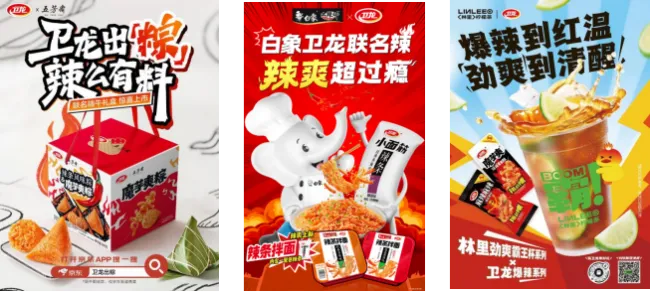 从单向广告灌输到双向情感互动,卫龙2025年的场景营销创新,成功让品牌从货架上的商品,变成了融入Z世代生活的情感载体。这一年,卫龙的跨界联名覆盖多场景、多圈层,与肯德基的“疯四”限定合作,让卫龙成为年轻人的社交货币;与五芳斋推出的辣味端午粽子,让传统节日变身品牌创意舞台;和白象打造的辣条拌面、与林里柠檬茶发起的爆辣挑战,更是打破零食场景边界,将产品延伸至正餐、饮品消费场景。此外,卫龙牵手国潮品牌哭喊中心、热门IP《魔道祖师》,精准触达潮流、二次元圈层,让品牌在年轻群体中实现全方位破圈。