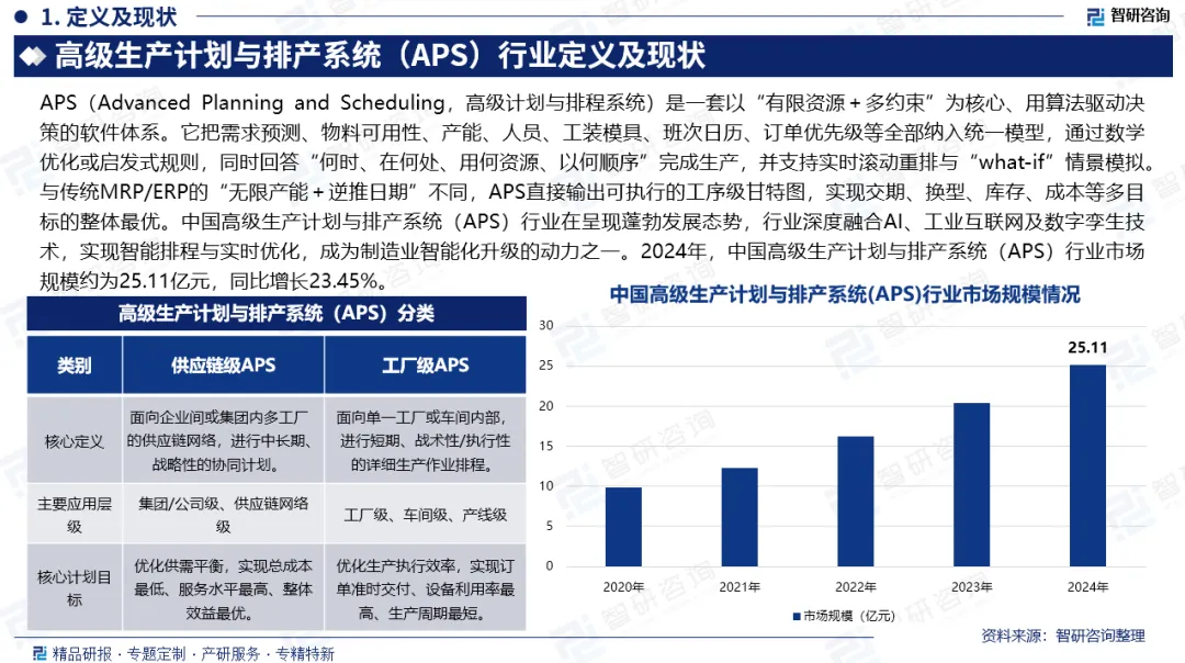 市场规模:中国高级生产计划与排产系统(APS)行业在呈现蓬勃发展态势,行业深度融合AI、工业互联网及数字孪生技术,实现智能排程与实时优化,成为制造业智能化升级的动力之一。2024年,中国高级生产计划与排产系统(APS)行业市场规模约为25.11亿元,同比增长23.45%。