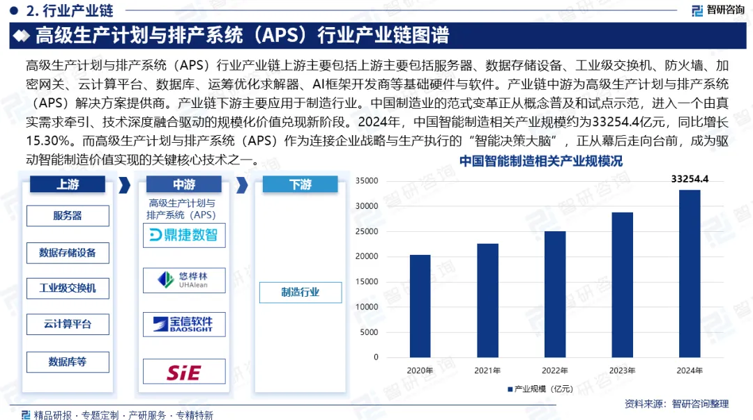 行业发展有利因素:随着AI算法、运筹优化求解器、云计算平台的成熟,为系统提供强大的计算与决策能力,如AI预测可提前模拟需求波动风险,提升供应链韧性。市场需求方面,中国制造业规模全球第一,33254.4亿元的智能制造产业规模催生海量APS需求,尤其在新能源、汽车、电子等高附加值行业,企业对精准排程、成本优化的需求迫切。