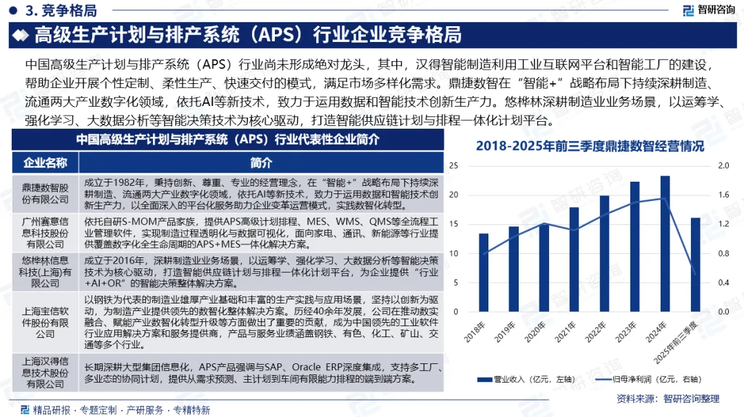 竞争情况:中国高级生产计划与排产系统(APS)行业尚未形成绝对龙头,其中,汉得智能制造利用工业互联网平台和智能工厂的建设,帮助企业开展个性定制、柔性生产、快速交付的模式,满足市场多样化需求。鼎捷数智在“智能+”战略布局下持续深耕制造、流通两大产业数字化领域,依托AI等新技术,致力于运用数据和智能技术创新生产力。悠桦林深耕制造业业务场景,以运筹学、强化学习、大数据分析等智能决策技术为核心驱动,打造智能供应链计划与排程一体化计划平台。