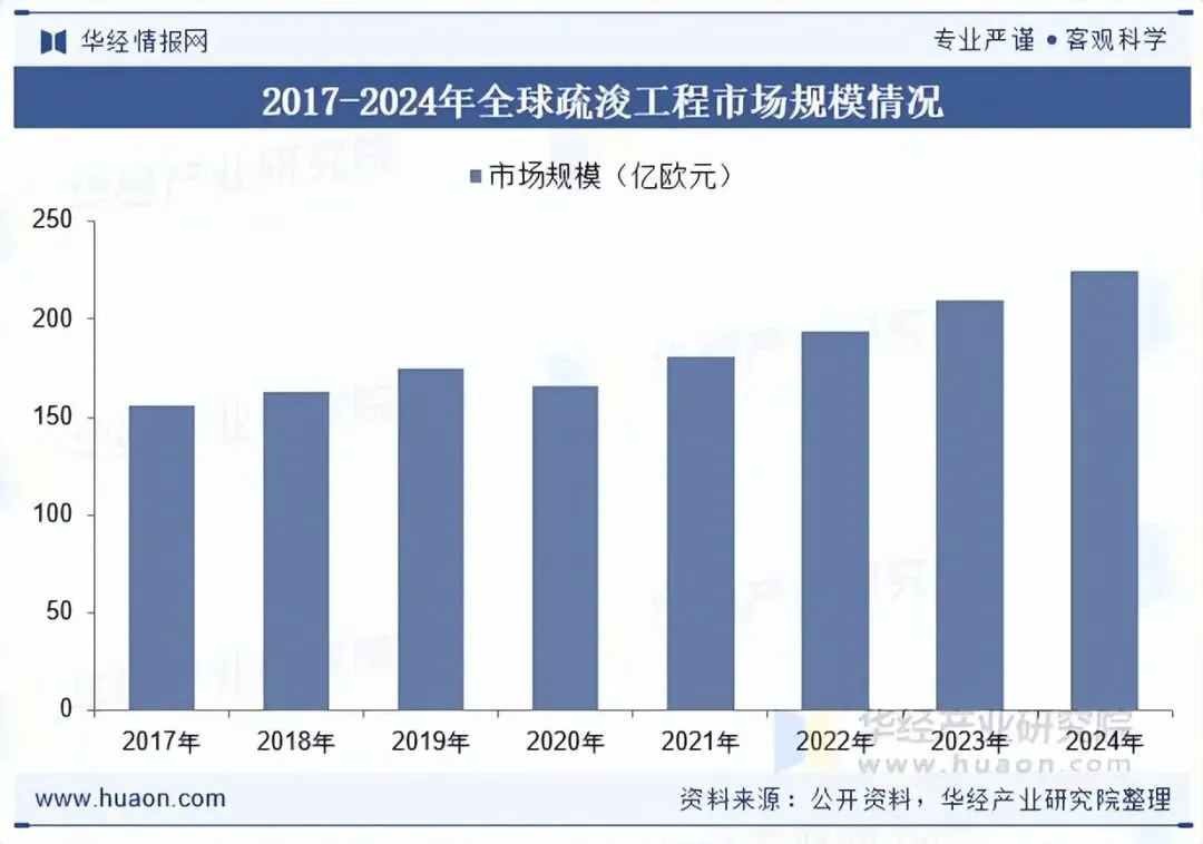 疏浚行业的发展已有数百年的历史,近年在经济全球化浪潮以及国际贸易快速发展的推动下,为适应集装箱及油轮运输大型化发展的需求,世界各国纷纷兴建港口、拓宽并挖深沿海航道,以提高通航能力。疏浚业务的持续发展使得其市场容量整体增长,在国民经济发展中的地位和重要性也日益提高,疏浚行业已成为世界沿海各国和海上运输大国不可或缺的基础产业之一。2024年全球疏浚工程市场规模约224.6亿欧元,同比增长7%。