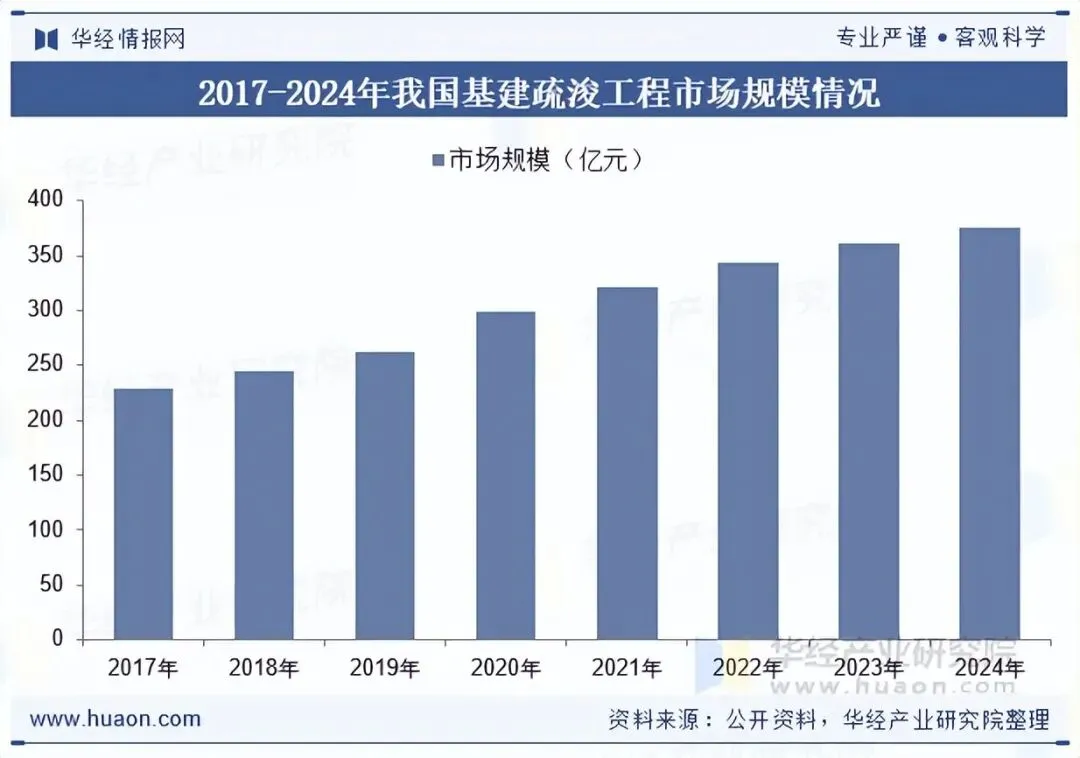基建疏浚的目的是增加水域的容量,以满足如运输、防洪、灌溉等特定的需求。它对于水域的开发和经济发展具有重要的作用。例如,在河流的治理中,基建疏浚可以清除河床中的泥沙和障碍物,拓宽河道,提高河流的泄洪能力,减少洪水灾害的发生。在港口的建设中,基建疏浚可以挖掘出深水区,建设深水泊位和航道,提高港口的吞吐能力和通航条件。2024年我国基建疏浚工程市场规模约为375.4亿元,同比增长3.76%。