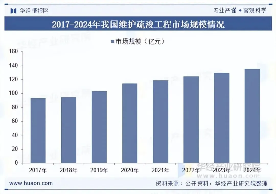 维护疏浚的目的是保持水域的清洁和畅通,提高水域的使用效率和安全性。例如,在河流的维护中,维护疏浚可以定期清理河床和河岸上的垃圾和沉积物,防止河道堵塞和洪水灾害的发生。在湖泊和水库的维护中,维护疏浚可以清除水底的藻类和杂草,保持水质清洁和水库的有效运行。在港口的维护中,维护疏浚可以定期清理航道和泊位上的沉积物,确保港口的通航能力和安全。2024年我国维护疏浚工程市场规模约为135.4亿元,同比增长4.4%。