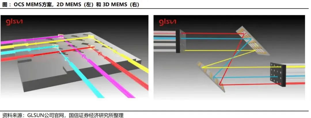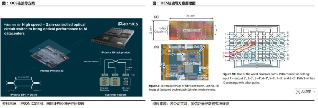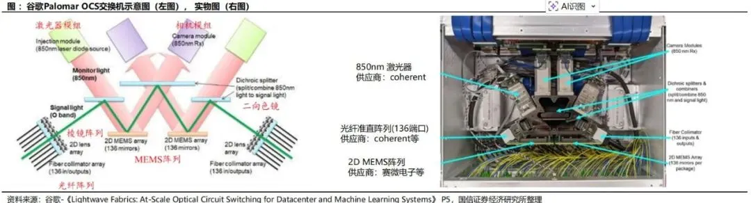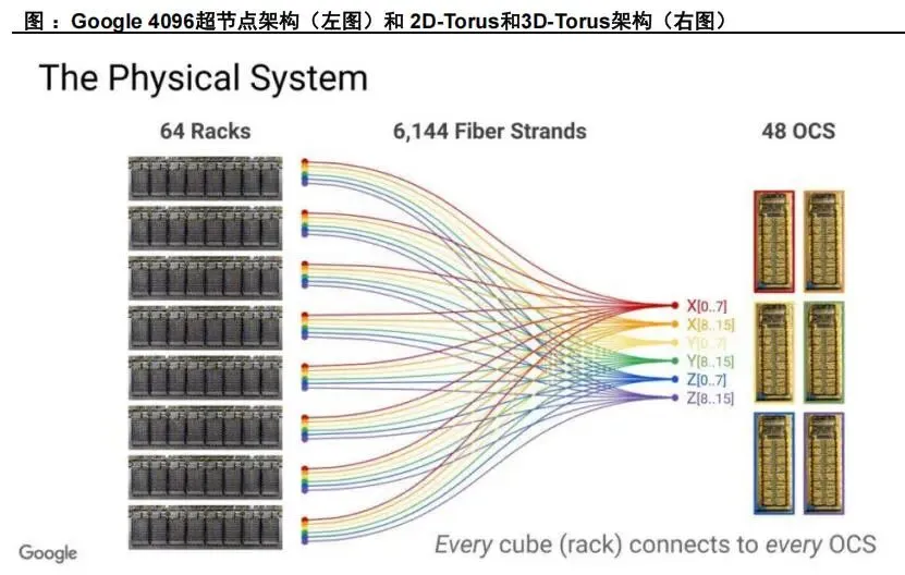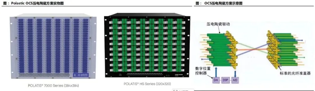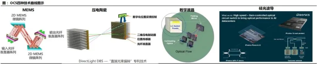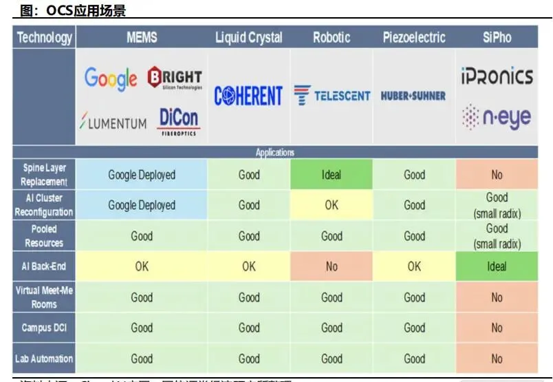 电交换机擅长细粒度、动态、复杂流量管理;OCS擅长大颗粒、稳定、高带宽链路构建。未来更现实的行业方向是构建分层网络:由电交换处理不确定流量,由OCS承担大带宽稳定互连,由硅光/共封装光学进一步推动板级与机架级高速连接。三者协同将比任何单一路径更符合产业规律。四大技术路线对比:MEMS、液晶、压电陶瓷、硅光波导MEMS OCS通过微机电反射镜阵列实现光束在三维空间中的偏转。典型架构是输入光经准直后射向第一组MEMS镜面,再经第二组镜面校正后耦合到目标输出端口。其优势在于:端口规模大、插入损耗较低、已验证可商用、适合构建中高端口数OCS系统。尤其是3D MEMS在功耗、空间利用率和性能上更优,是当前最具现实落地能力的方案。但MEMS的挑战也十分明确:第一,核心MEMS器件制造难度高,对工艺、封装、校准要求严苛;第二,系统中光纤阵列、镜头、环形器、相机模组等配套器件复杂,整机BOM较高;第三,长期可靠性和批量一致性仍需持续优化。尽管如此,考虑到谷歌已将其推向实际部署,MEMS仍是现阶段判断OCS产业趋势时最重要的观察主线。5.2 数字液晶路线:可靠性与大端口能力兼具,但切换偏慢数字液晶OCS的核心是利用液晶分子在电场下改变偏振或折射状态,从而控制光束路径。液晶方案没有复杂机械微镜运动,理论上在寿命、可靠性、驱动电压等方面具备一定优势,并能支持较大端口规模。从产业视角看,其在冗余备份、低频重构和部分静态网络配置场景中具有实际价值。问题在于,液晶方案切换时间通常为数十到数百毫秒,明显慢于更高速的动态控制需求;同时,其对精密装调工艺要求高,人工装配成本高,难以迅速做到低成本大规模交付。因此,液晶路线更适合作为特定场景下的稳健方案,而非短期内全面主导市场的通用路径。压电陶瓷方案通过压电执行器驱动光纤准直器进行微米级形变或位移,从而改变光路。其优点是光路链路短、插损低、控制精度高、稳定性较好,部分场景下传输性能优于其他路线。由于驱动机制直观、工作稳定,其在工业级应用中具备一定吸引力。但压电路线的最大问题在于端口扩展性。每增加一个端口就需要相应的驱动与控制通道,系统复杂度和空间布置难度随端口数上升而迅速提高,不适合超大规模端口矩阵。因此,压电路线更可能定位于中小规模、高可靠、特定行业应用,而非超大规模AI数据中心的核心主流。5.4 硅光波导路线:长期最具想象空间的集成化方向硅光波导OCS通常基于MZI、微环、热光或载流子调制等结构,通过改变波导折射率实现开关功能。它最大的吸引力在于:可与CMOS工艺兼容,具备单片集成、高密度、小型化和潜在低成本量产能力,切换速度也可能做到微秒甚至更快。从长期技术演进看,硅光波导路线有望与光I/O、共封装光学、片上互连一起构成新一代高集成光互连平台。但现阶段其短板同样突出:插入损耗偏高,串扰问题显著,热稳定性控制复杂,级联后损耗累积明显,且大规模一致性和可靠性仍待验证。换句话说,硅光路线更像是"技术上最性感、商业上仍需时间"的方向。中长期值得重点布局,短期产业兑现度仍弱于MEMS。综合产业成熟度、客户验证进度和商业化条件,当前判断是:短期看MEMS,中期看液晶补位与MEMS升级,长期看硅光集成化。压电路线则更偏特定利基市场。未来行业格局并不一定由单一路线完全统一,不同客户和场景可能长期共存多种方案。AI训练集群通常由大量GPU/TPU机柜组成,不同训练任务对网络路径有不同要求。OCS能够在机柜间、Pod间或超节点间快速建立高带宽直连通路,减少多级电交换带来的时延和功耗。对于需要频繁重组算力资源池的大型云厂商而言,这种"可重构的物理网络"具有明显吸引力。传统叶脊架构虽然具备良好的扩展性,但在超大规模AI场景中,随着端口数和链路数上升,脊交换层的成本和功耗会越来越高。若在部分层级引入OCS,可将原本需要多跳电交换的流量改造为较直接的光层连通,减轻上层交换芯片负担。尤其在训练作业周期较长时,静态或半静态光路更容易释放系统价值。谷歌TPU体系是当前最典型案例。Torus结构中,各节点之间存在规则且持续的通信需求,特别适合使用OCS对部分连接进行高效承载。资料显示,TPUv4与TPUv7对应的超节点规模与OCS端口需求显著增加,这表明随着芯片集群规模扩大,网络光层设备的数量、端口和价值量也同步跃升。尽管当前讨论主要聚焦数据中心内部互连,但从长期看,OCS也可能在数据中心间互联、跨园区算力池调度、科研超算系统和专用行业算力网络中获得应用。尤其当"东数西算"、国家算力网络和多地域AI资源调度需求增加时,光层可重构能力可能从机房内逐步外延至园区级甚至跨中心级网络。需要强调的是,OCS并不适合所有数据中心工作负载。对于高随机性、小流量、突发型流量场景,电交换仍更高效。OCS真正适合的是大带宽、低抖动、持续时间长、连接模式相对可预测的任务。因此,行业渗透节奏不会是"一刀切替换",而是从最有利的AI集群场景开始逐步外扩。谷歌长期坚持自研TPU和数据中心网络架构,对系统级TCO极其敏感。其业务特征决定了公司具备同时掌握芯片、服务器、网络、软件栈和数据中心设计的能力,因此更容易评估OCS在整套基础设施中的系统收益。与传统设备采购逻辑不同,谷歌更像是在"定义新