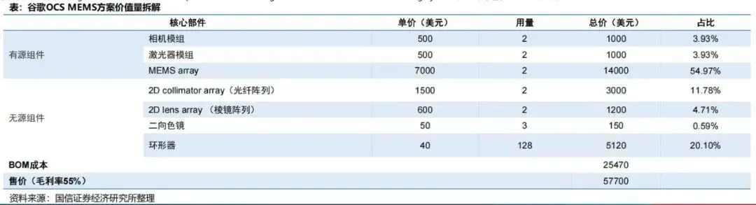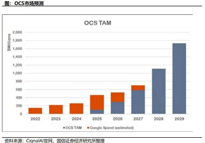 从行业演进规律看,新技术早期往往由少数头部客户驱动,整机厂商的客户集中度高、交付模式非标准化,短期业绩弹性未必立刻体现;而一旦技术路线确定,关键器件和材料因被纳入标准BOM,其受益确定性反而更高。以MEMS路线为例,MEMS阵列、准直器阵列、透镜阵列、环形器、镜片、相机模组、激光器等均构成价值量重要组成部分。端口数从300升级到600时,很多器件需求接近成倍增长,直接带来量价齐升逻辑。OCS不是一个可以简单"拼装"的设备。尤其在液晶和MEMS方案中,光路校准、角度控制、温漂补偿、一致性测试和系统级调试都极具挑战。谁掌握精密装调、批量校准和长期稳定性控制能力,谁就更有机会真正形成交付壁垒。这也是为什么很多企业即使掌握部分单点器件能力,也未必能顺利切入整机环节。其一,为海外头部设备或方案商供应用于OCS的光学元器件和材料;其二,在MEMS代工、精密光学组件和无源器件方面形成工艺优势;其三,面向硅光波导等新路线提前布局样机和联合研发;其四,结合国内算力中心建设,在中小规模或定制化场景中验证整机能力。未来三至五年,产业链大概率经历三个阶段:第一阶段是"技术路线验证与少数客户导入",上游器件先受益;第二阶段是"整机方案标准化提升",具备系统交付能力的厂商价值提升;第三阶段是"硅光集成与软件定义控制增强",产业从器件主导逐步转向平台主导。中国企业若想获得更高附加值,必须从单一器件供货向系统协同、联合设计和整机能力迈进。OCS市场空间不能只用"单台价格 × 出货量"做静态估算,更应从算力集群数量、单集群端口需求、单位端口价值量、客户渗透率、场景扩展范围五个维度来测算。现阶段行业仍处于早期导入阶段,统计口径并不完全统一,有的机构按整机市场口径统计,有的将部分相关模块与系统能力纳入估算,因此不同机构给出的市场规模存在差异是正常现象。不过,即使口径不同,行业研究结论仍较为一致:OCS已经从"单一客户导入验证"进入"市场快速扩容前夜",未来三到五年具备高增长确定性。9.2 全球OCS市场规模:已有明确的第三方预测数据根据Cignal AI于2025年末发布的《The Optical Circuit Switching Market - 4Q25》研究,全球OCS市场到2029年将"保守地"达到25亿美元。该机构同时指出,随着运营商和云厂商对OCS能力认知提高、供应链信心增强,数据中心内可采用OCS的应用场景正在持续扩展。结合资料,Cignal AI此前对2025年市场规模的测算约为4亿美元。据此测算,2025-2029年全球OCS市场规模对应的复合增长率约为58.1%。这意味着行业处于典型的高成长新兴赛道阶段。若以更保守方式仅参考行业早期版本预测值,市场仍呈现显著向上趋势。从增量角度看,按25亿美元减去4亿美元估算,2025-2029年全球OCS市场新增空间约为21亿美元。这21亿美元并非由单一客户完全贡献,而是建立在以下三项扩张逻辑基础上:第一,Google自身AI集群持续扩容;第二,Google之外的头部客户开始验证与导入;第三,OCS应用从超节点互连逐步向更多数据中心网络层级外溢。9.3 出货量判断:市场扩张不只是价格推升,更有设备数量增长支撑在出货量维度,LightCounting在其2024年10月市场预测中将OCS列为未来五年快速增长的相关产品之一,并覆盖至2029年的需求预测。结合资料中的行业整理口径,LightCounting对OCS的判断是:2029年OCS年出货量有望突破5万台。如果按这一口径倒推,意味着OCS不是"单价高但出货极少"的小众设备,而是已经具备向更大规模部署扩张的产业基础。若用"2029年市场规模25亿美元、年出货量5万台"进行静态折算,则对应行业平均单台价值量约为5万美元/台。这一数值与当前市场上高端大端口OCS整机的价值量级大体匹配,但需要说明的是,该平均值会受到不同端口规格、技术路线、整机与模块口径差异影响,不能简单视为统一售价。进一步看,若以2025年4亿美元市场规模和行业仍处早期导入期来判断,当年出货基数大概率明显低于2029年水平。这意味着未来市场增长并非主要依靠涨价,而更可能来自三方面叠加:一是出货量增加,更多客户采购、更多场景部署;二是单机价值量提升,端口数从300端口向600端口甚至更高规格升级;三是系统附加值提升,控制软件、调度能力、配套器件价值同步增长。9.4 需求侧拆解:AI集群扩容是OCS市场最核心的拉动力量从需求来源看,当前OCS的第一性需求来自AI训练集群和超大规模数据中心互连。资料显示,在Google TPU v4架构中,4096颗TPU集群需要48台300端口OCS交换机;在TPU v7(Ironwood)架构中,9216颗TPU集群对应48台600端口OCS交换机。这组数据说明,随着AI芯片集群规模提升、互连带宽需求抬升,单个超节点所需OCS端口规模和整机价值量都在同步上升。若进一步按资料中的价值量口径估算,Google 600端口OCS整机成本或可达到约5万美元/台。若一个超节点需要48台,则单个超节点对应的OCS设备价值量约为240万美元。这还未完全计入系统集成、冗余设计、控制软件和配套高端器件的额外价值。因此,只要头部客户每年新增若干大规模AI集群,OCS市场就会快速形成较强弹性。换言之,OCS市场本质上不是"传统通信设备自然增长"的逻辑,而是被AI基础设施建设节奏所拉动的算力网络资本开支品类。这一属性决定了其景气度将高度跟随全球AI数据中心投资周期。9.5 产业验证数据:订单与积压规模已经开始证明市场需求行业预测之外,更