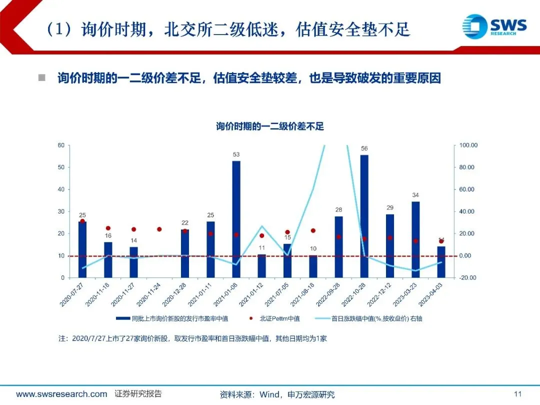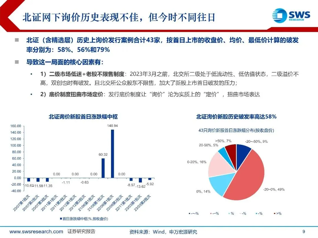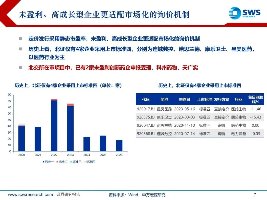 北证询价重启渐近,开启高质量扩容新篇章。随着在审科技型明星项目数故量的增长,北证目前单一的直接定价发行方式亟待优化,询价重启或渐行渐近。1直接定价下、科技型企业难以充分募资:定价依据国静态市盈率,部分创新属性更强、但盈利规模暂未起量的科技前沿型企业,或面临大幅缩减募资额,长期看,不利于北证对科技型企业的吸引力。2未盈利、高成长型企业更适配市场化的询价机制。政策积极表态,提及"更好发挥北交所支持科技创新作用"、"用好第四套未盈利企业上市标准",重启询价发行是应有之义。此外,北证在审项目中,已有两家未盈利创新药企申报受理(科州药物和天广实)。