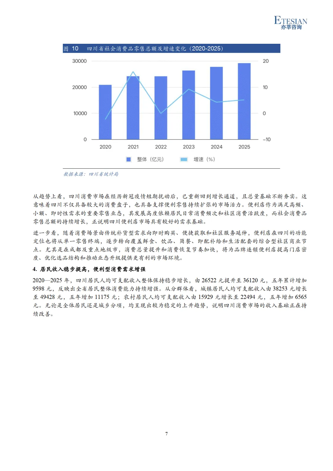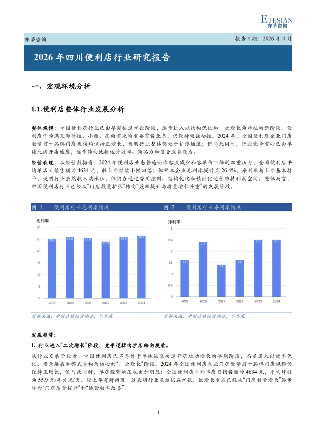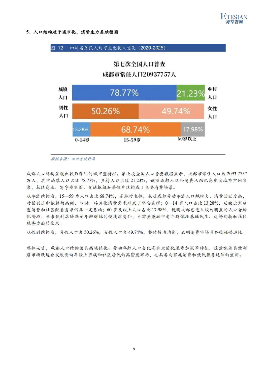 2026 年亦莘咨询发布的四川便利店行业报告显示,全国便利店行业已从规模扩张转向提质增效的二次增长阶段,行业竞争聚焦运营效率、商品力与复合服务能力,餐饮化、社区化、24 小时经营成为主流趋势。四川凭借经济稳步增长、人口基数大、城镇化率提升与消费市场扩容,成为西南便利店核心市场,整体处于成熟初期向中期过渡阶段,未饱和但竞争加剧。————