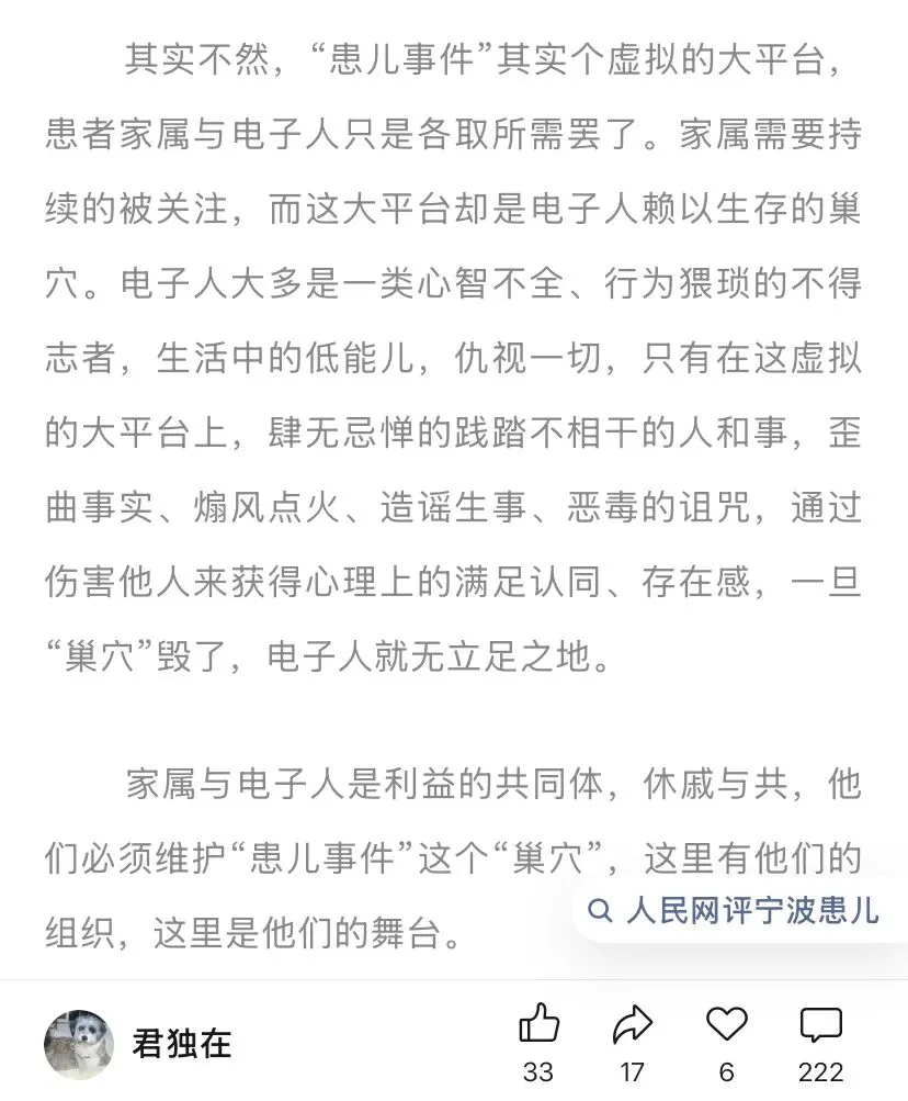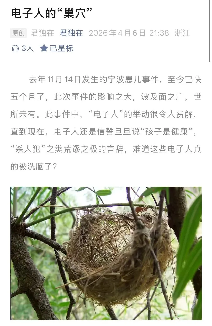 刚刚一个读者给我发信息,说走了财报真探,又来了个君独在,君独在又开始蹦跶了。我看了一下君独在的文章:4月6日君独在写了篇电子人的“巢穴”。电子人大多是一类心智不全、行为猥琐的不得志者,生活中的低能儿。仇视一切,只有在这虚拟的大平台上,肆无忌惮的践踏不相干的人和事,歪曲事实、煽风点火、造谣生事、恶毒的诅咒,通过伤害他人来获得心理上的满足认同、存在感...也算得上是老相识,它曾数次写文章说我网暴它甚至说我是放火犯。这是君独在头像,有点意思,这小狗眼睛好像瞎了,不知咋瞎的?好可怜的小狗。曾记否,在那个寒冷的冬天,财报真探蹦跶的时候,它每蹦跶一下,就按它一下,最终财报真探删文注销账号灰溜溜的跑路了。前段时间,财报真探阴魂不散,起死回生,试图重出江湖。有读者第一时间告诉我,我还写了篇文章:“财报真探”竟然自主注销了公众号…最终结果,财报真探再次删文,再次注销账号,再次灰溜溜的跑路了。反观这个君独在,除了骂就是骂,除了扣帽子还是扣帽子,除了情绪输出还是情绪输出...不知这个君独在又是何方神圣?小洛熙妈妈曾在君独在文章下留言:说君独在是某某人的母亲或者是丈母娘。不过,君独在这个名字起的很有意思。君独在,意思是:只剩下它一个人在蹦跶了...喝口酒压压惊。我是今曾老师本人,有需要买酒的老朋友加我个人微:372984749。推荐爆款系列:2016年生产,正宗的10年52度浓香型老酒,240元一箱,一箱6瓶。我自己就喝这酒,酒质和口感绝对。相信今曾老师人品就OK了,谢谢大家支持。