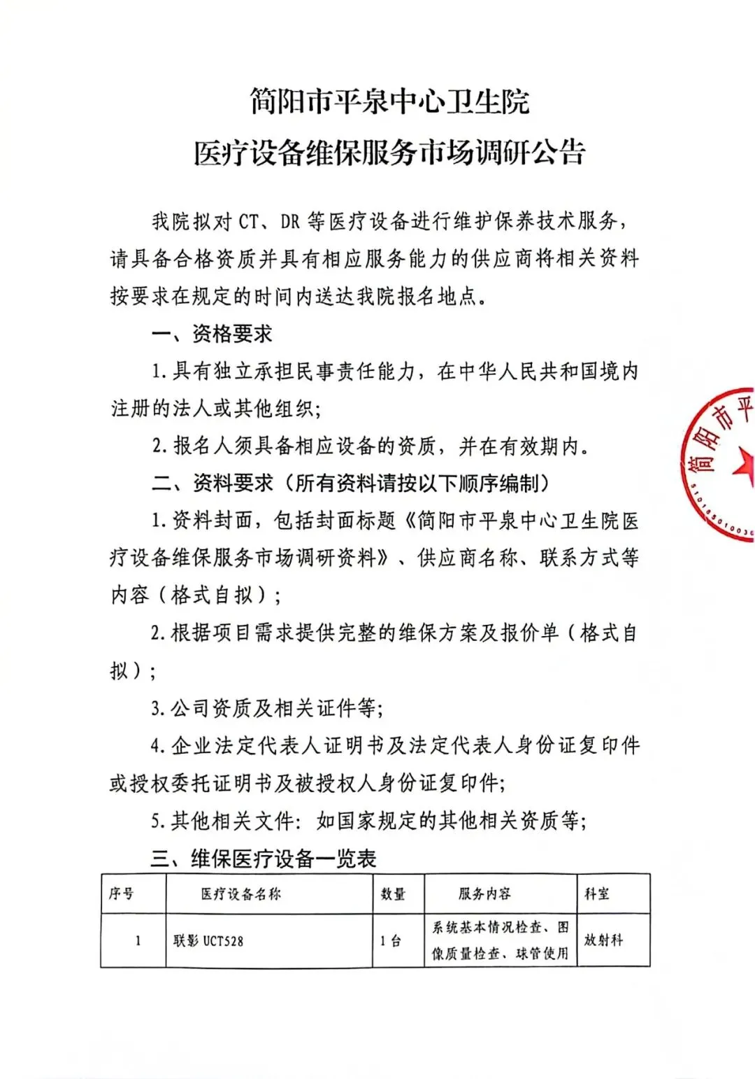 简阳市平泉中心卫生院医疗设备维保服务市场调研公告