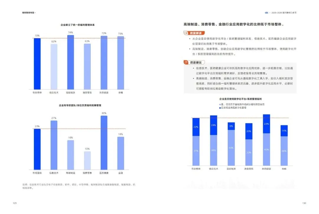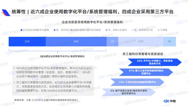 •现状:七成企业建立统一福利管理体系,但仅23%设有独立福利管理岗;59%企业使用数字化平台,但37%仅用于基础操作,处于表层应用阶段。