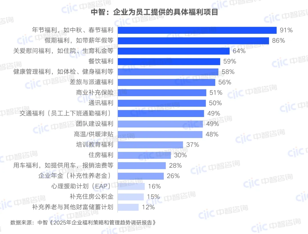 •现状:九成企业提供年节和假期福利,六成提供关爱慰问、餐饮和健康福利,超七成福利覆盖全员。