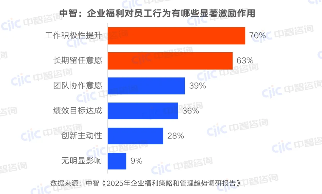 •现状:福利在“工作积极性”“长期留任”上效果突出,62%企业认为福利对文化传播有正面作用。