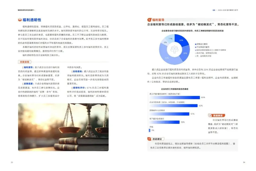 •现状:超八成企业进行福利宣导,67%员工对透明性评价较高,超八成员工可实时查询福利使用情况。