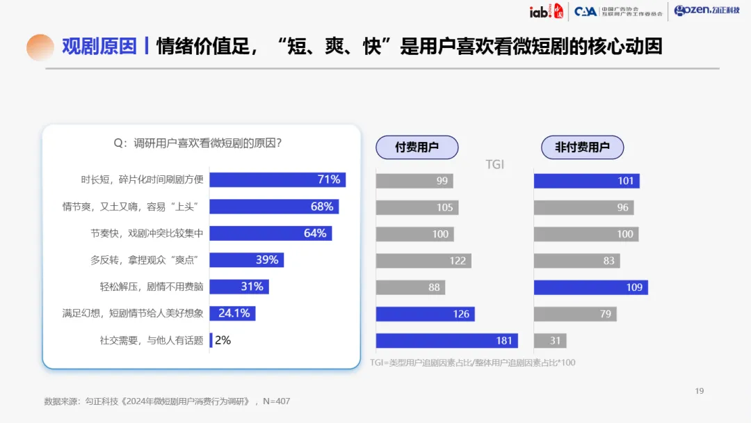 • 用户偏好与内容趋势:“短、爽、快”是核心观剧动因,霸总爱情、逆袭复仇、喜剧搞笑为最受欢迎题材;IAA免费剧集中在20集以内,尤以都市爱情、家庭情感类播放量最高,适合品牌植入与情绪共鸣。