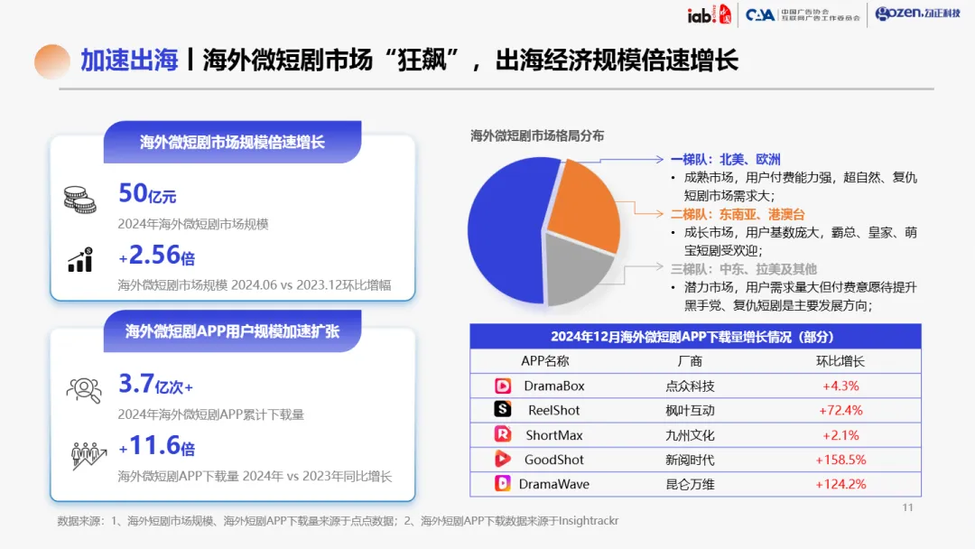 • 市场规模与增速:2024年微短剧全渠道播出总量超4万部,产业规模预计2025年突破600亿元;海外微短剧市场更呈爆发式增长,2024年市场规模达50亿元,APP下载量同比增长11.6倍,出海红利显著。