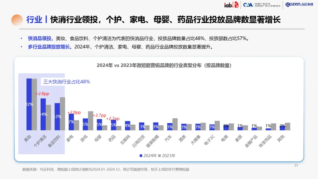 • 投放节奏与行业差异:美妆、食品饮料等行业集中在春节、618、双11等节点密集投放;母婴、家电类则在下半年大促季发力明显,品牌需结合自身品类特性制定节点化投放策略。