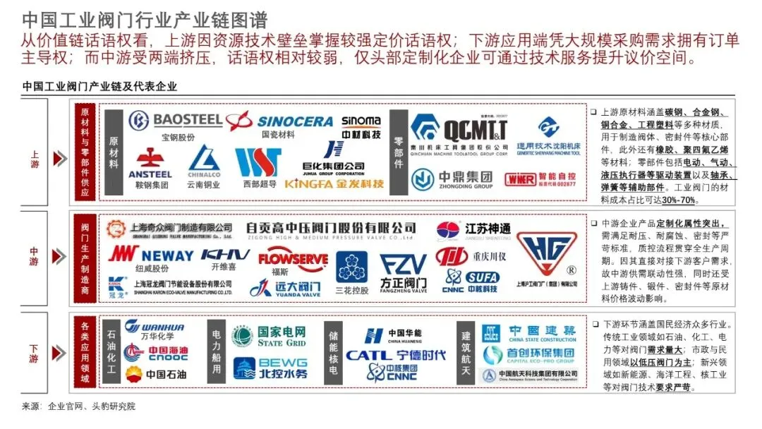 应用领域:下游环节涵盖国民经济众多行业。传统工业领域如石油、化工、电力等对阀门需求量大;市政与民用领域以低压阀门为主;新兴领域如新能源、海洋工程、核工业等对阀门技术要求严苛。
