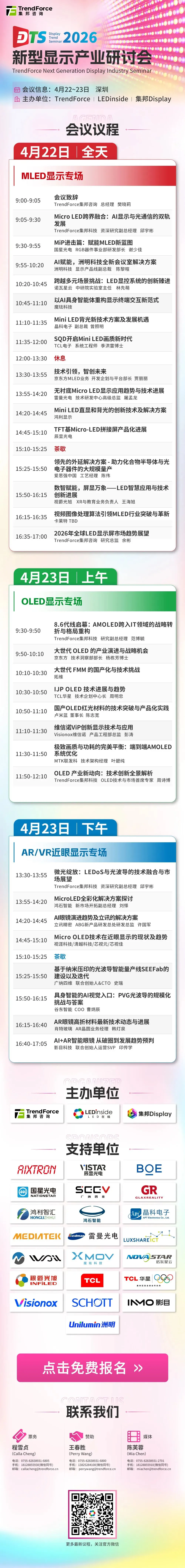 免费报名2026新型显示产业研讨会(DTS),共同解码MLED、OLED发展。4月22-23日深圳见!