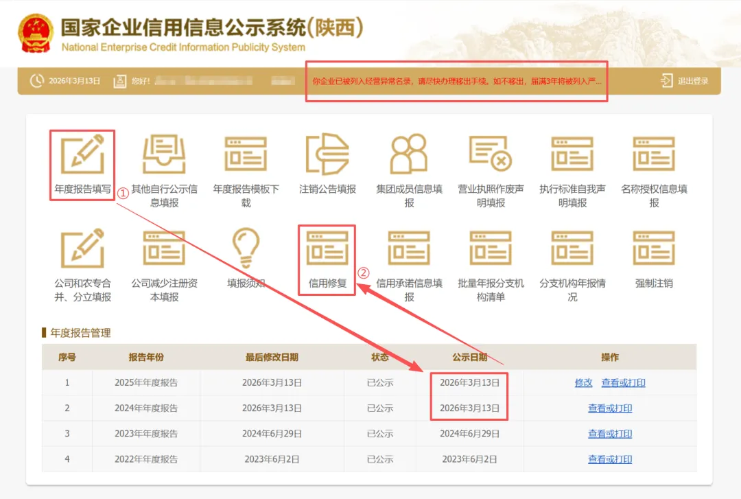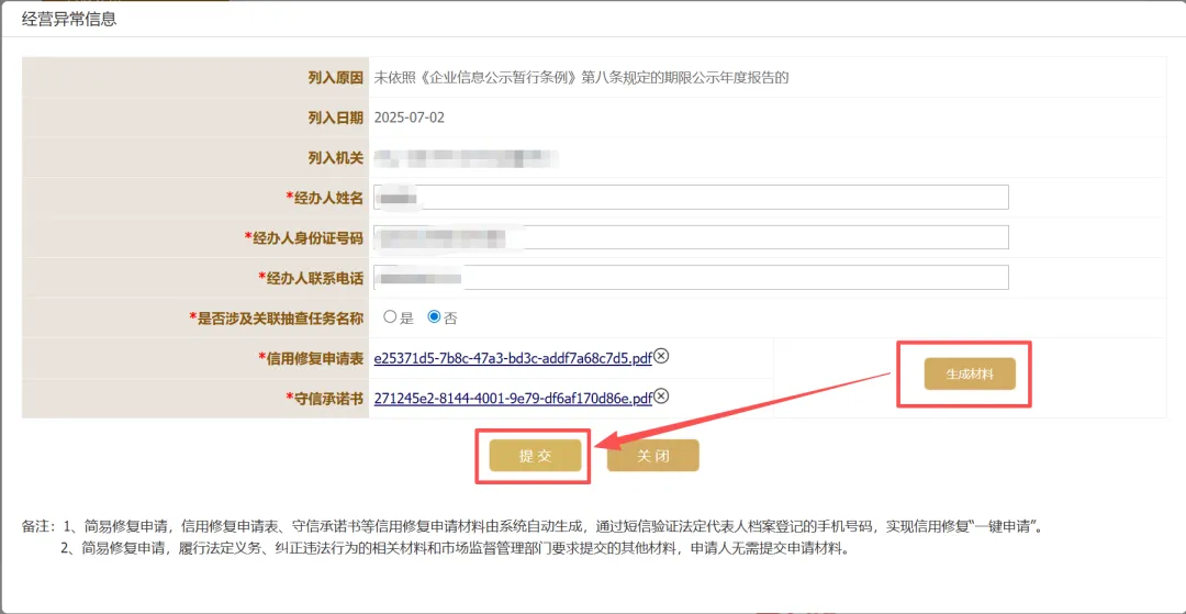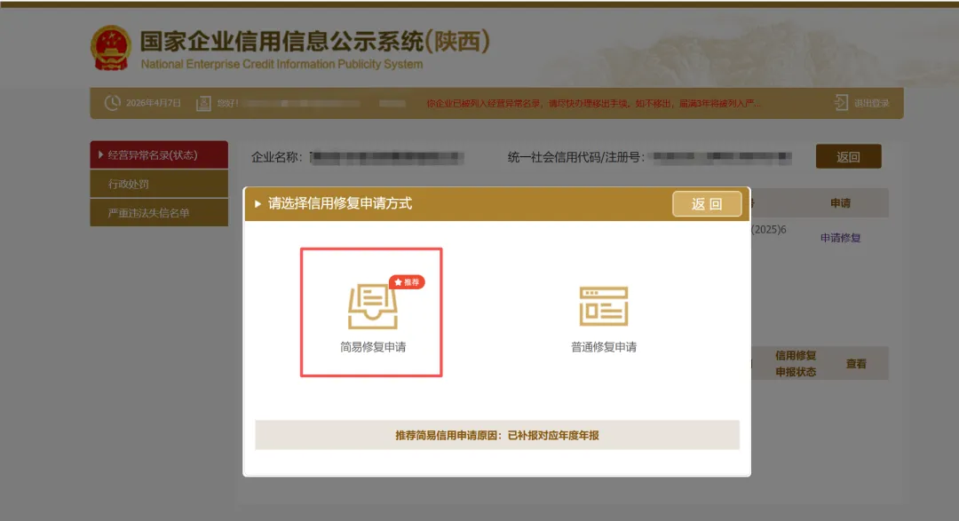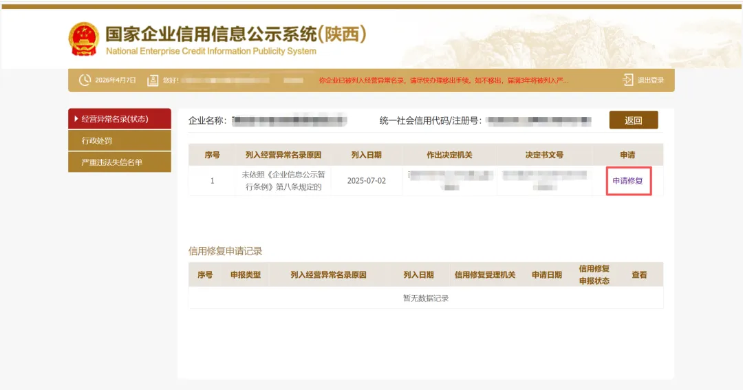 经营异常名录信息修复