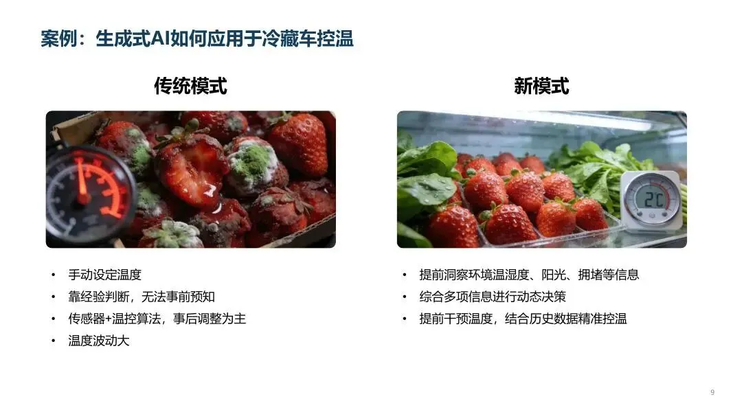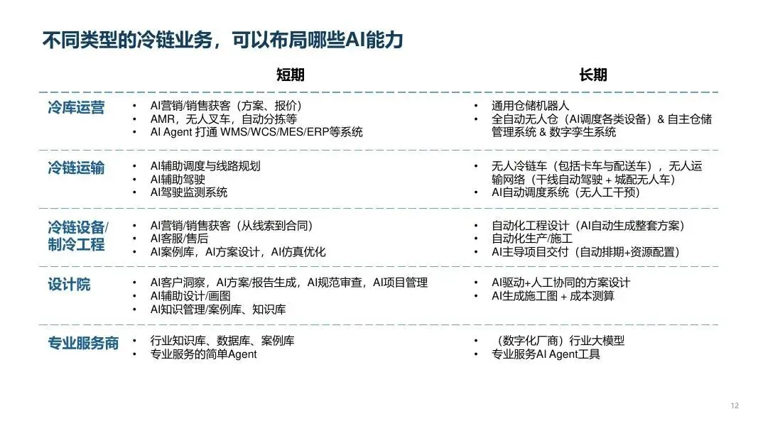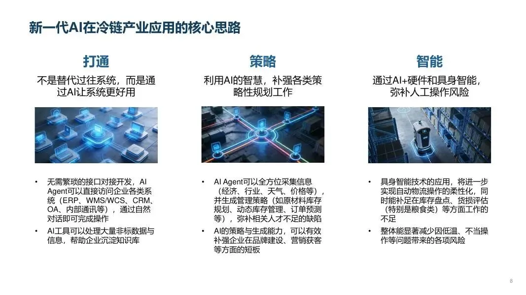 AI Agent可以全方位采集信息(经济、行业、天气、价格等)并生成管理策略(如原材料库存规划、动态库存管理、订单预测等),弥补相关人才不足的缺陷Al的策略与生成能力,可以有效补强企业在品牌建设、营销获客等方面的短板具身智能技术的应用,将进一步实现自动物流操作的柔性化,同时能补足在库存盘点、货损评估(特别是粮食类)等方面工作的不足整体能显著减少因低温、不当操作等问题带来的各项风险。