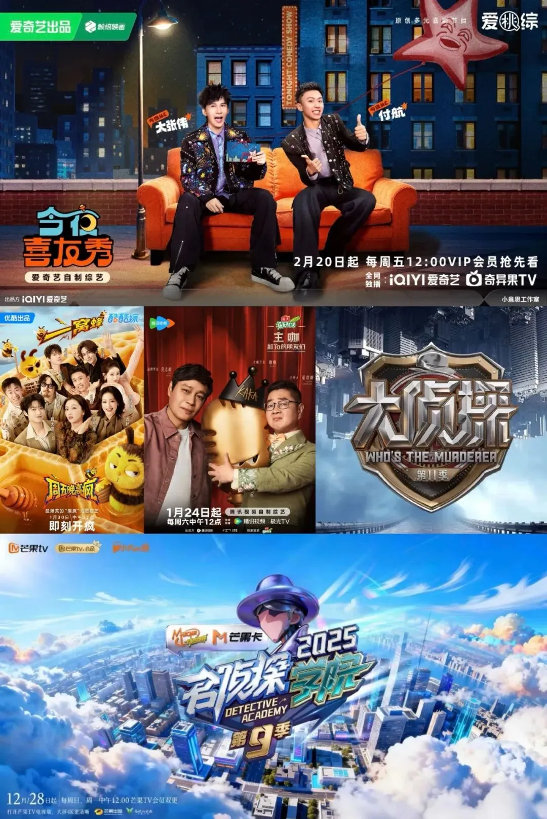 2月,各平台自制在更节目涵盖脱口秀、游戏、推理等多个垂直类型,表现出高播放、高互动的显著特征。爱奇艺脱口秀节目《今夜喜友秀》2月20日上线,本月更新至第2期,列平台综艺节目播放量第4、评论量第2。优酷游戏类节目《周五晚高疯》2月6日上线,本月更新至第4期,位列该平台综艺节目播放量第3,弹幕数、评论量第1。腾讯视频脱口秀节目《主咖和Ta的朋友们》1月24日上线,本月更新至第5期,播放量、弹幕数均位列该平台综艺节目第3;芒果TV推理类节目《大侦探 第十一季》《名侦探学院 第九季》分别于2026年1月、2025年12月上线,均进该平台综艺节目播放量前6。数据表明,节目的独特性与新鲜感,是吸引观众、强化互动的有力保障。