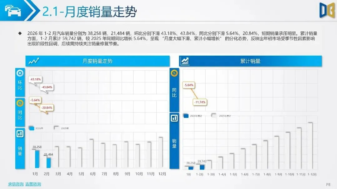 MPV、货车、客车占比分别为8.36%、3.54%、1.33%,交叉型占比仅0.18%;各车型销量均呈同比、环比双降态势,其中客车同比降幅最大(-71.57%)SUV环比降幅最大(-45.59%)轿车、MPV、货车、交叉型降幅也均超27%,整体车型市场承压显著。