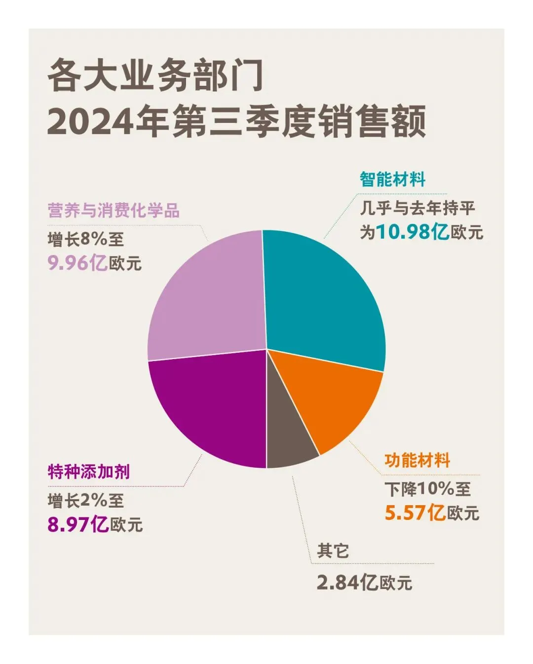 第三季度销售额增长8%,达到9.96亿欧元,销量和价格的增加因汇率的负面影响被部分抵销。受益于销售价格的同比上升以及销量略增,动物营养必需氨基酸业务销售额实现明显增长。因需求增加,医药健康业务的销售额也有所增加。该业务部门调整后的EBITDA增长53%,至1.94亿欧元,主要归功于必需氨基酸销售价格提高及动物营养业务模式优化带来的成本节约。调整后的EBITDA利润率从去年同期的13.7%显著提升至19.5%。