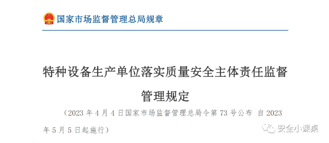 73号令:《特种设备生产单位落实质量安全主体责任监督管理规定》(2023 年4 月4 日国家市场监督管理总局令第73 号公布自2023年5 月5 日起施行)
