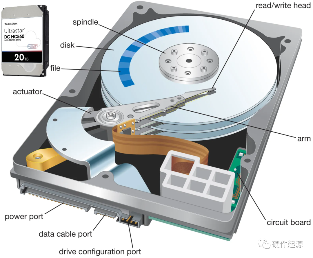 其中,HDD的供应商以希捷Seagate,东芝Toshiba和西部数据WDC为主。尽管消费者近些年直接使用HDD的机会在减少,例如2022年出货的笔记本电脑中有92%的装配了固态硬盘,但是HDD在NAS(Network Attached Storage)以及数据中心等应用中占较高的份额。下图为HDD的结构示意,主要元器件包括磁盘(disk/platter)、磁头(head)、电机,以及电路中的控制器、存储器等。