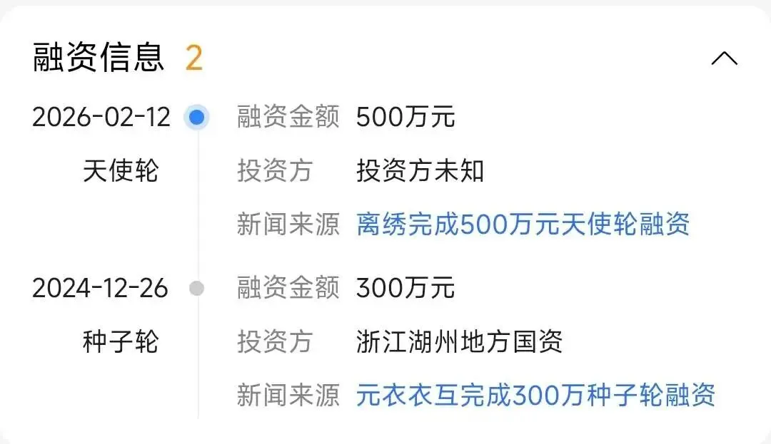 近日热度很高的离绣文化,是元衣衣互(湖州)科技有限公司旗下的数字藏品平台。企查查公开信息显示,元衣衣互(湖州)科技有限公司注册资本125万,并且已完成两轮融资,其中天使轮500万、种子轮300融资金额。