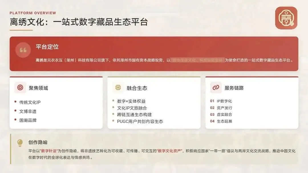 平台的核心聚焦领域清晰明确,精准卡位文化数字化细分赛道,并且采用双轮驱动的融合模式。不同于单纯的数字藏品发行平台,离绣文化打造的是“数字+实体”深度融合的生态体系。