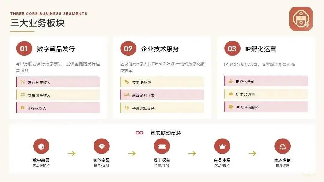 平台主要三大板块分别是数字藏品发行,企业技术服务,以及ip孵化运营。形成数字藏品确权→实体商品兑换→线下权益触达→会员体系沉淀→生态持续增值的完整闭环,解决数字资产“虚转实”落地难题,构建可持续发展的商业飞轮。