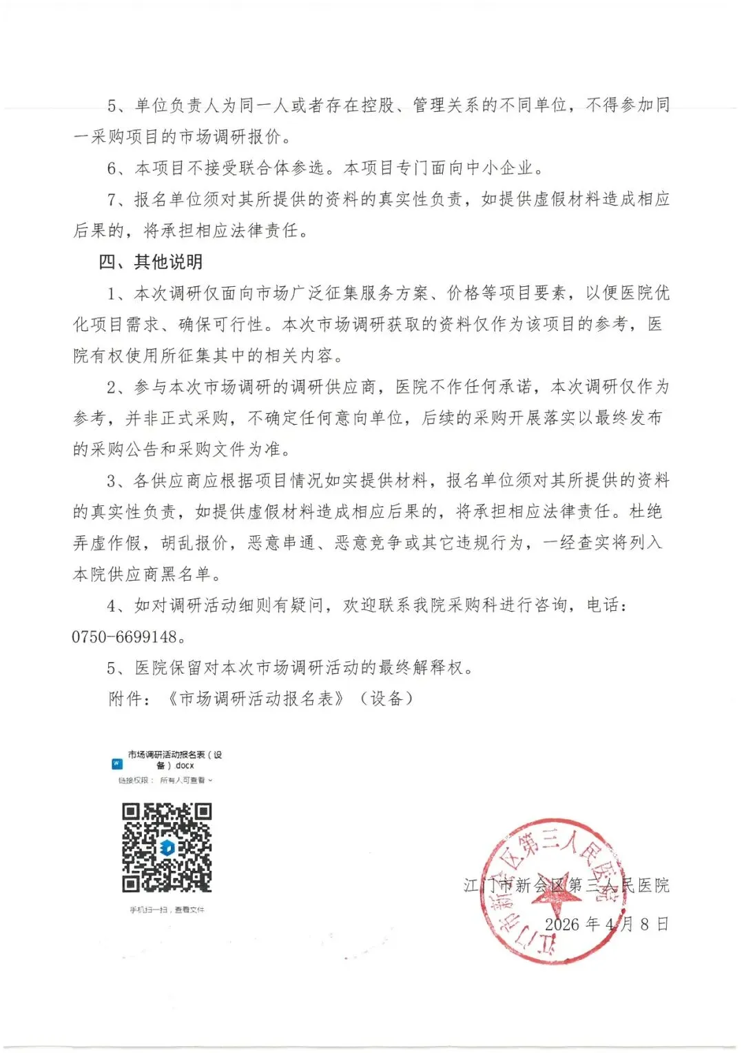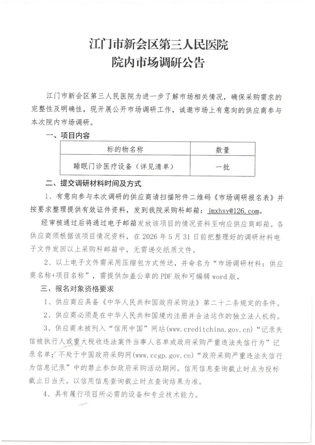 【市场调研公告】江门市新会区第三人民医院睡眠门诊医疗设备项目