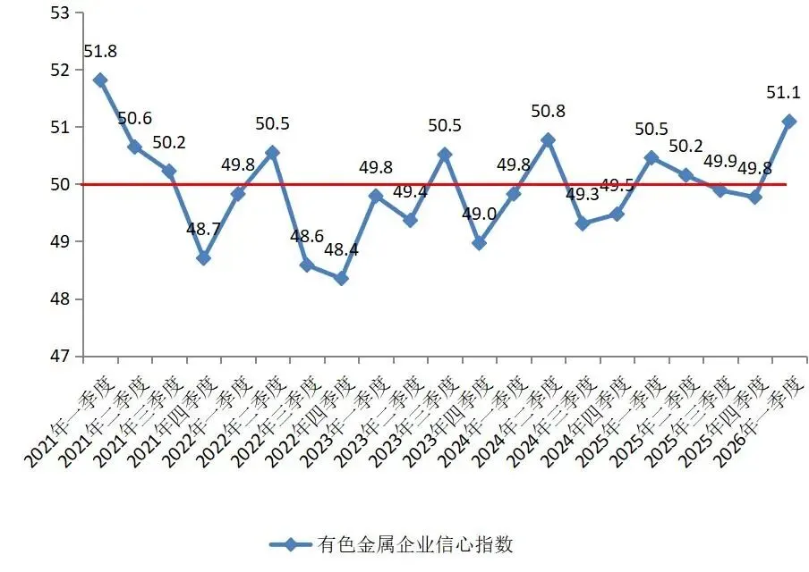 综合来看,2026年一季度,国内外宏观经济复杂运行,全球有色金属供需格局调整、国内稳增长政策发力,中国有色金属行业信心呈现即期平稳修复、预期显著走强的分化向好态势。从整体来看,行业短期运行稳健,企业对后市信心明显增强,预计二季度景气度有望持续改善。